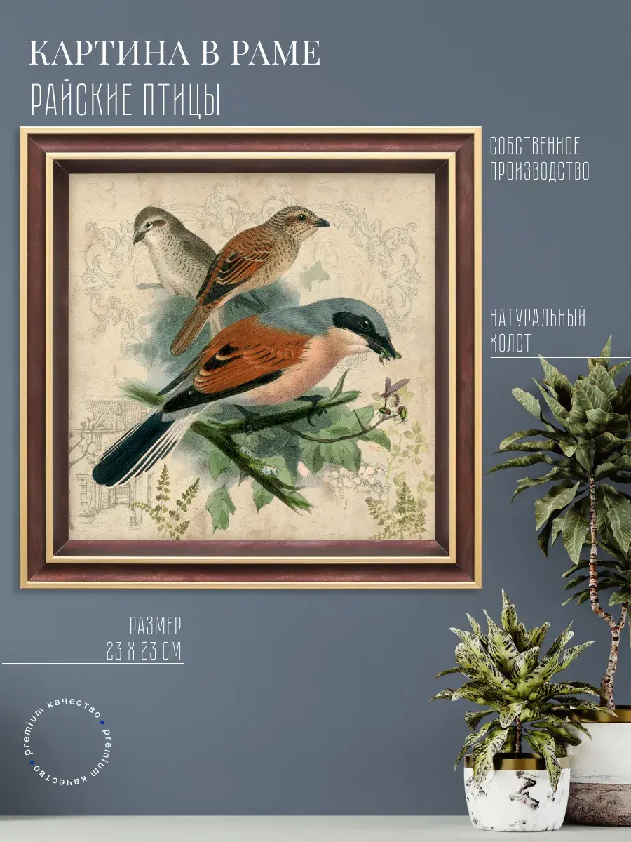 Чудесная картина, напечатанная на натуральном холсте, станет центром притяжения внимания в вашем доме. Райские птички привнесут в ваш интерьер ощущение покоя и умиротворенности.