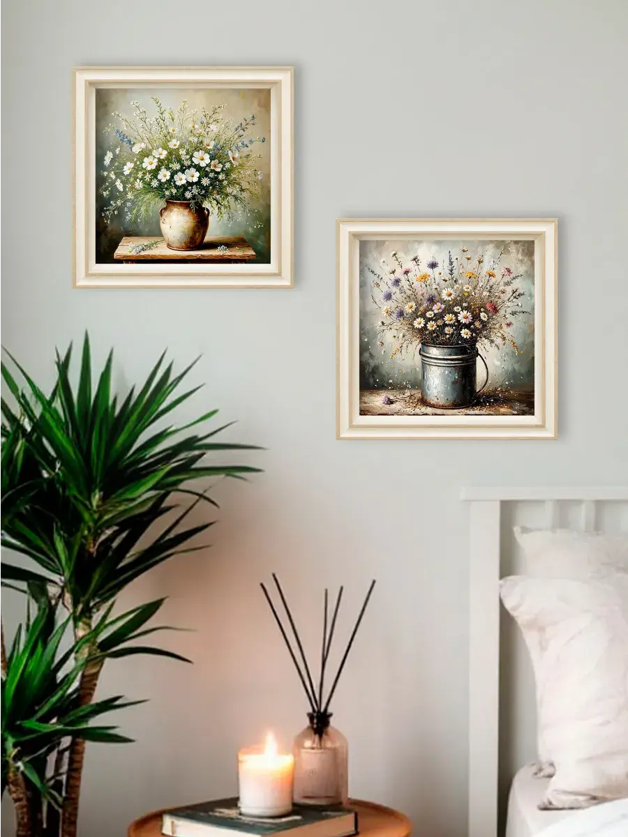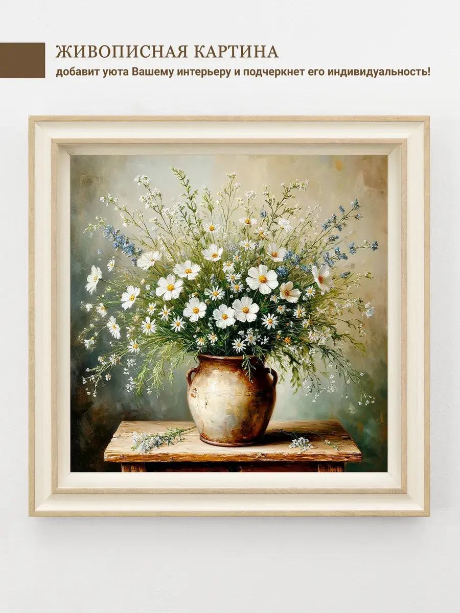 Чудесная картина, напечатанная на натуральном холсте, станет центром притяжения внимания в вашем доме. Удивительной красоты букеты с ромашками привнесут в ваш интерьер ощущение покоя и умиротворенности.