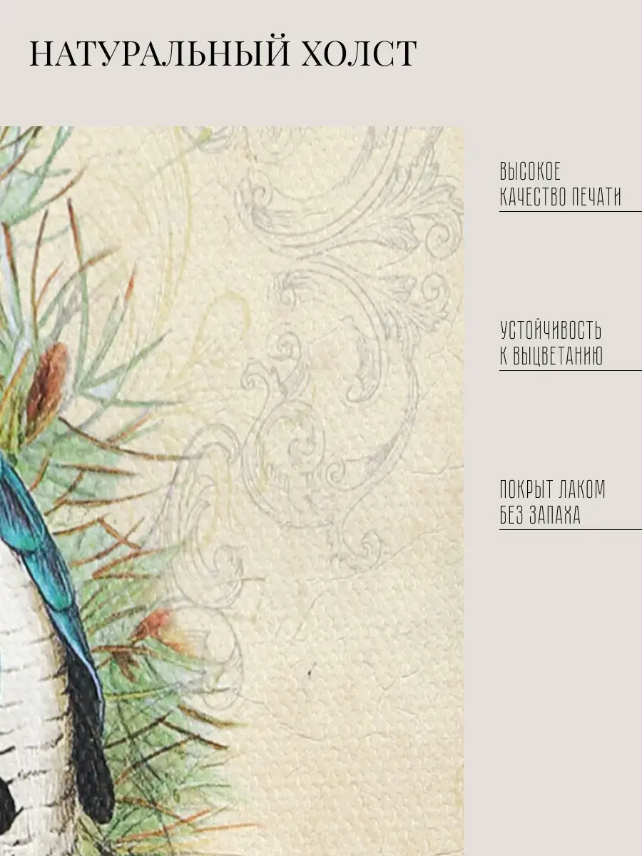 Чудесная картина, напечатанная на натуральном холсте, станет центром притяжения внимания в вашем доме. Сказочные птички привнесут в ваш интерьер ощущение покоя и умиротворенности.