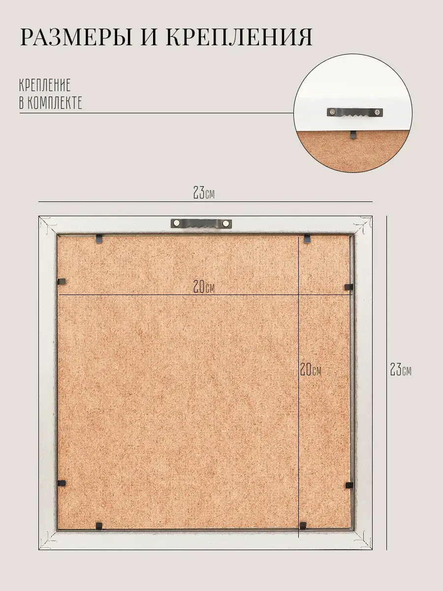 Размер картины в раме 23*23 см. Холст наклеен на ХДФ, что позволяет избежать провисания. Картина покрыта лаком для защиты изображения. Поставляется в надежной, жесткой упаковке.
