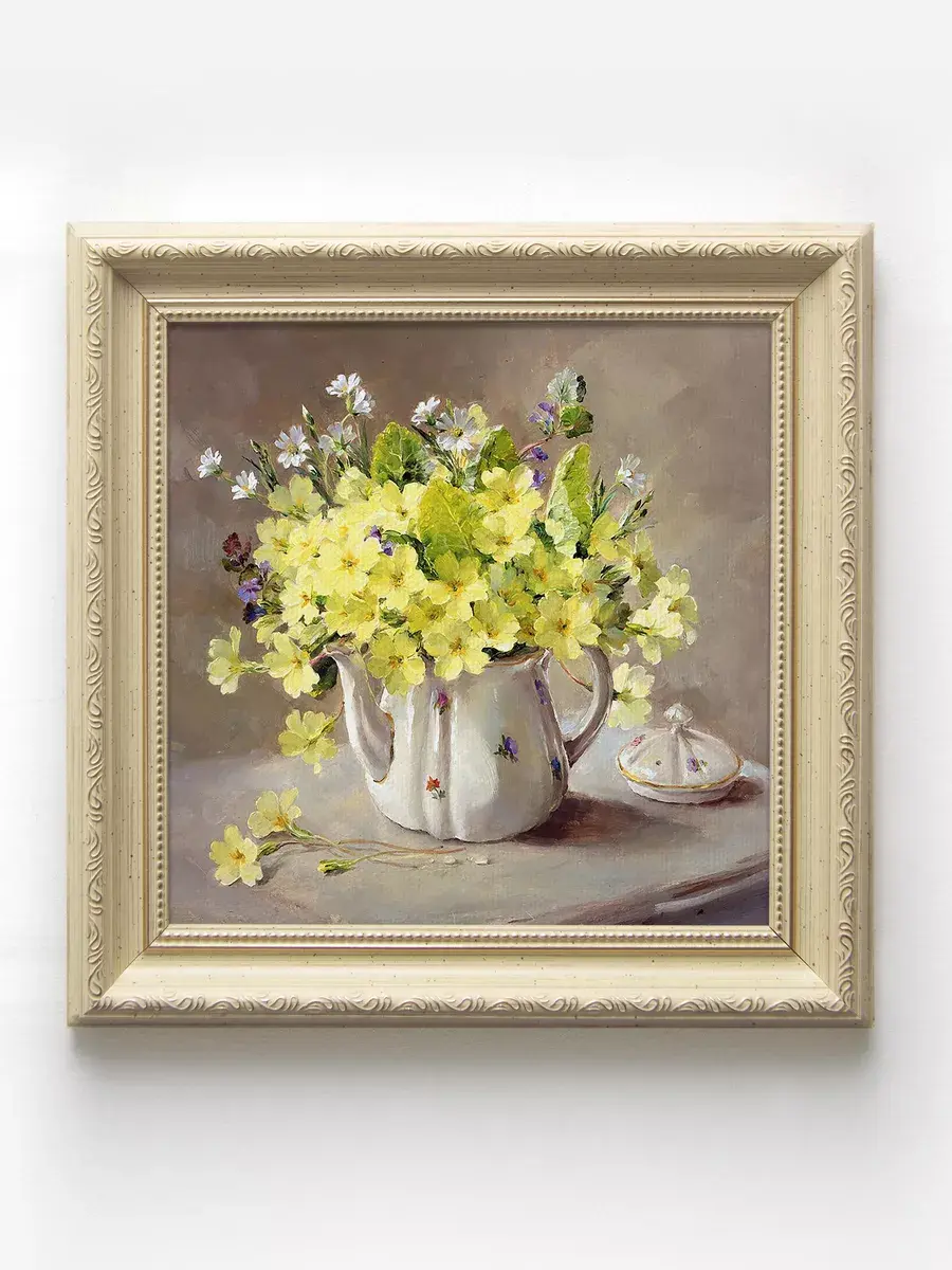 Картина напечатана на натуральном холсте, покрыта лаком. Для защиты от провисания холст наклеен на хдф. Рама из полиуретана классическая теплая бежевая полуматовая под дерево. Картины небольшого размера 25*25 см по раме, холст 20*20, см, для создания коллекций. Упакованы в коробку, крепление для стены в комплекте.