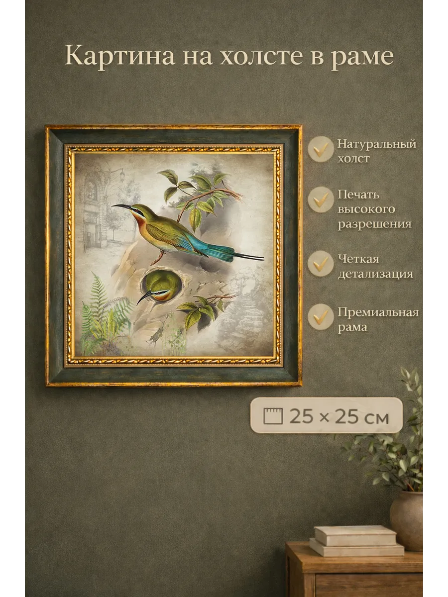 Картина на холсте в раме «Птички Прованса» 25×25 см — стильная интерьерная картина на стену, которая добавит дому уют, гармонию и атмосферу элегантности. Нежный природный сюжет с птицами и мягкая цветовая палитра делают эту картину универсальным декором для современного и классического интерьера.