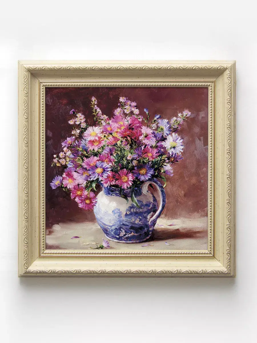 Картина напечатана на натуральном холсте, покрыта лаком. Для защиты от провисания холст наклеен на хдф. Рама из полиуретана классическая теплая бежевая полуматовая под дерево. Картины небольшого размера 25*25 см по раме, холст 20*20, см, для создания коллекций. Упакованы в коробку, крепление для стены в комплекте.