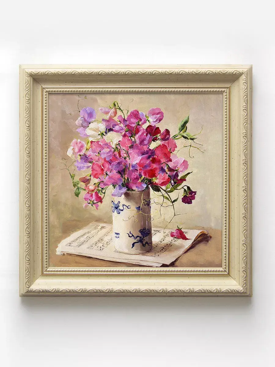 Картина напечатана на натуральном холсте, покрыта лаком. Для защиты от провисания холст наклеен на хдф. Рама из полиуретана классическая теплая бежевая полуматовая под дерево. Картины небольшого размера 25*25 см по раме, холст 20*20, см, для создания коллекций. Упакованы в коробку, крепление для стены в комплекте.