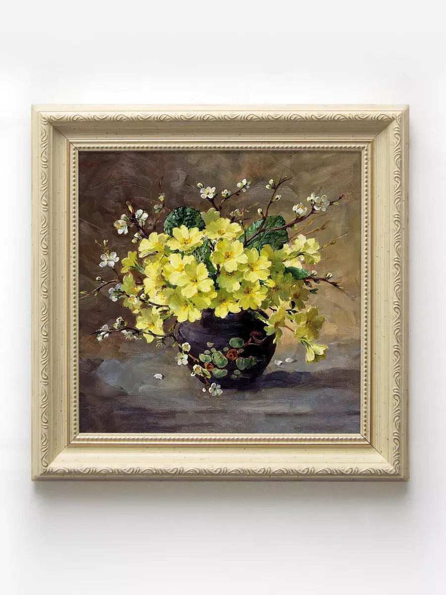 Картина напечатана на натуральном холсте, покрыта лаком. Для защиты от провисания холст наклеен на хдф. Рама из полиуретана классическая теплая бежевая полуматовая под дерево. Картины небольшого размера 25*25 см по раме, холст 20*20, см, для создания коллекций. Упакованы в коробку, крепление для стены в комплекте.