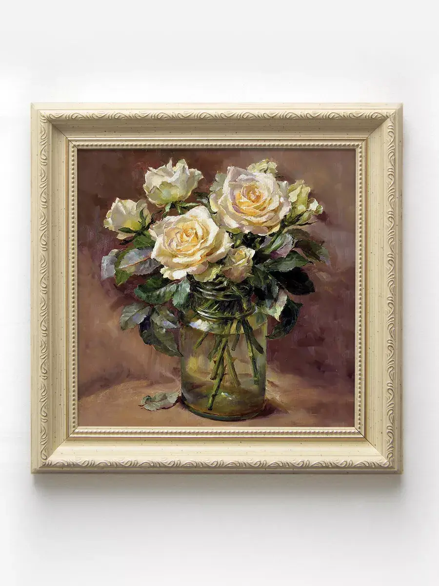 Картина напечатана на натуральном холсте, покрыта лаком. Для защиты от провисания холст наклеен на хдф. Рама из полиуретана классическая теплая бежевая полуматовая под дерево. Картины небольшого размера 25*25 см по раме, холст 20*20, см, для создания коллекций. Упакованы в коробку, крепление для стены в комплекте.
