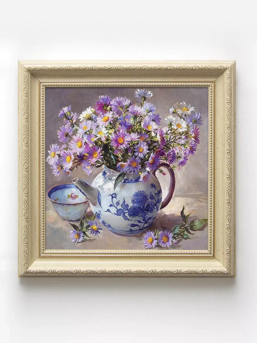 Картина напечатана на натуральном холсте, покрыта лаком. Для защиты от провисания холст наклеен на хдф. Рама из полиуретана классическая теплая бежевая полуматовая под дерево. Картины небольшого размера 25*25 см по раме, холст 20*20, см, для создания коллекций. Упакованы в коробку, крепление для стены в комплекте.