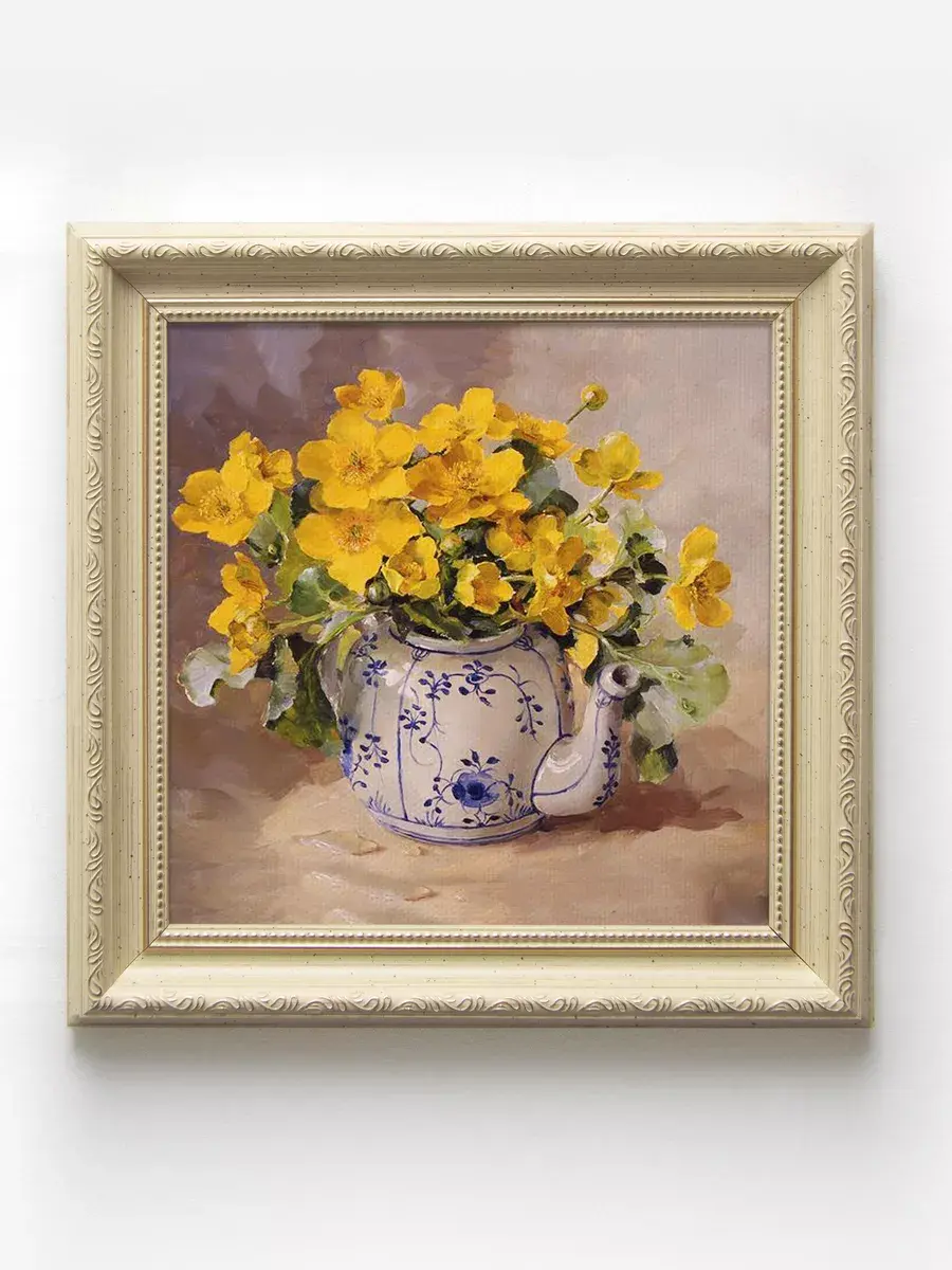 Картина напечатана на натуральном холсте, покрыта лаком. Для защиты от провисания холст наклеен на хдф. Рама из полиуретана классическая теплая бежевая полуматовая под дерево. Картины небольшого размера 25*25 см по раме, холст 20*20, см, для создания коллекций. Упакованы в коробку, крепление для стены в комплекте.