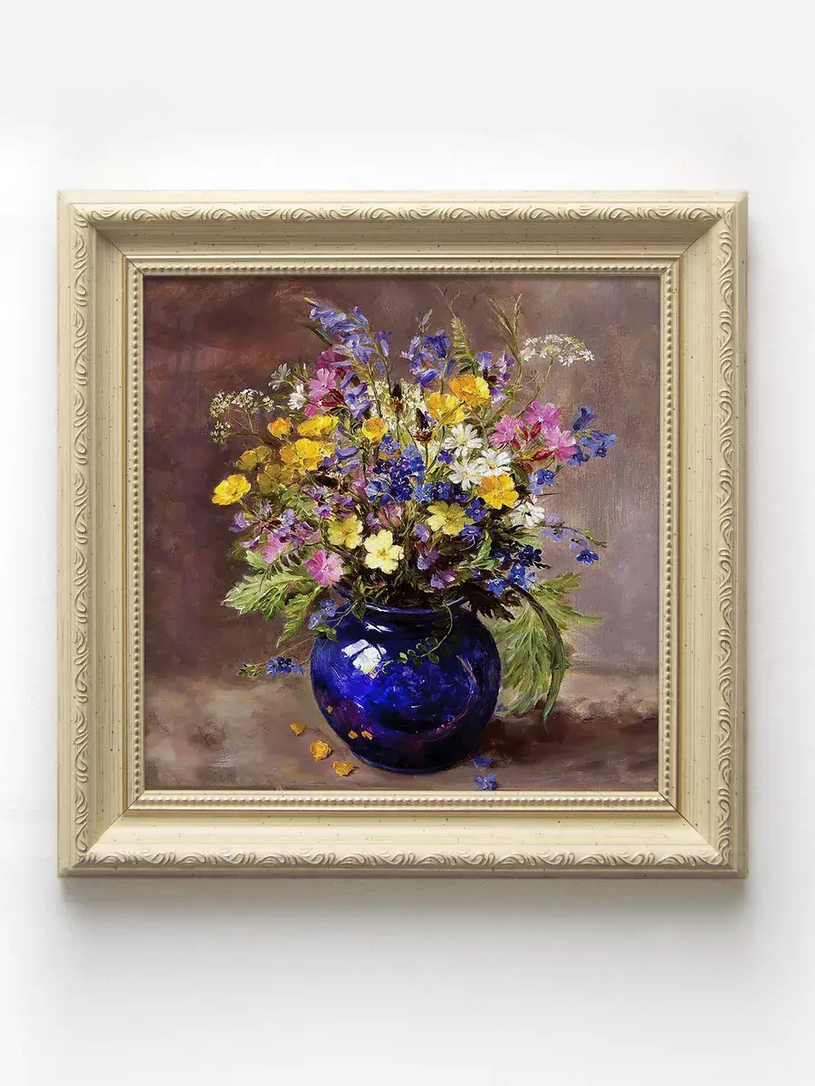 Картина напечатана на натуральном холсте, покрыта лаком. Для защиты от провисания холст наклеен на хдф. Рама из полиуретана классическая теплая бежевая полуматовая под дерево. Картины небольшого размера 25*25 см по раме, холст 20*20, см, для создания коллекций. Упакованы в коробку, крепление для стены в комплекте.
