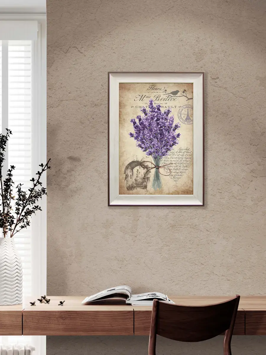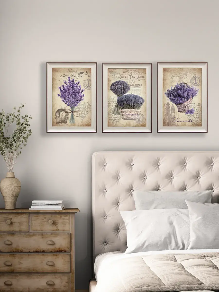Чудесная теплая серия картин с лавандой наполнит ваш дом атмосферой летнего Прованса. Винтажные картины в сочитании с лаконичной рамой теплого цвета добавят вашему интерьеру изюминку, украсят небольшую кухню или спальню.