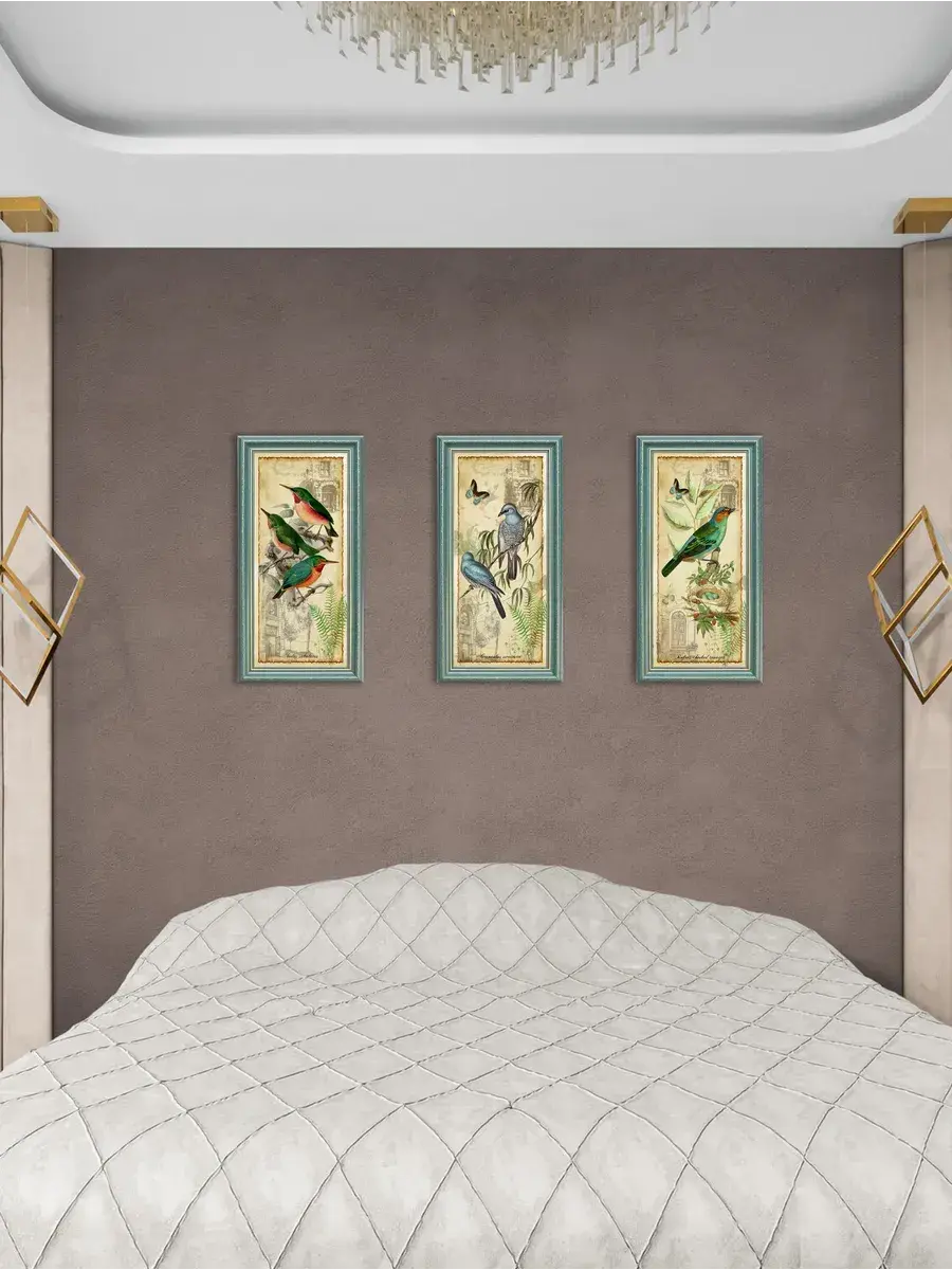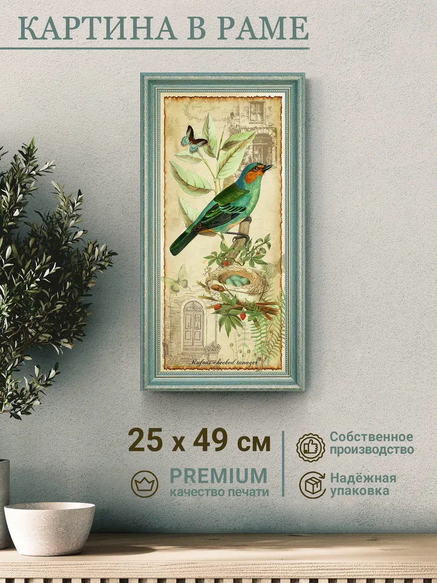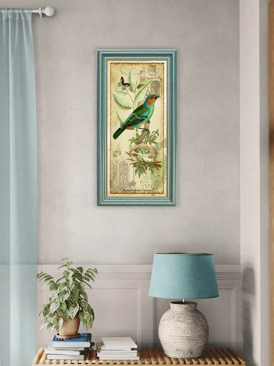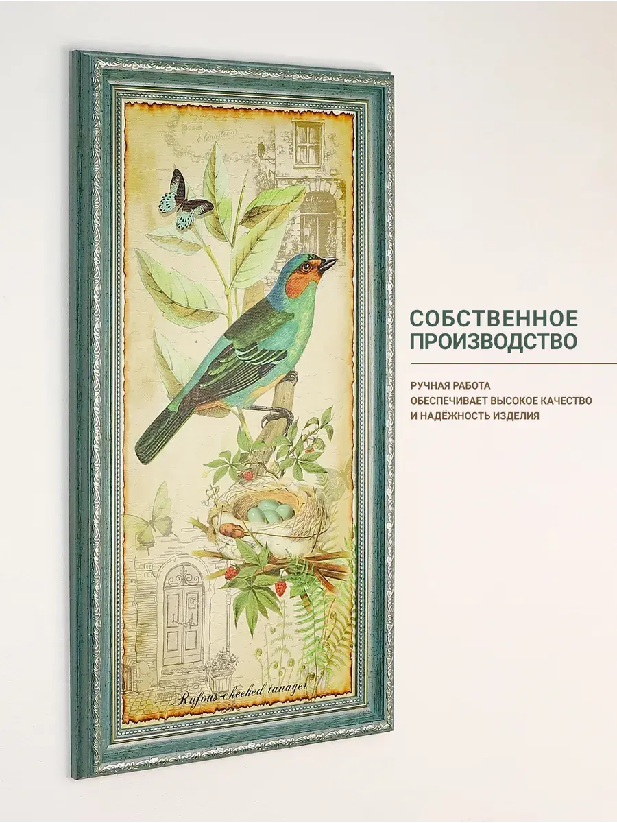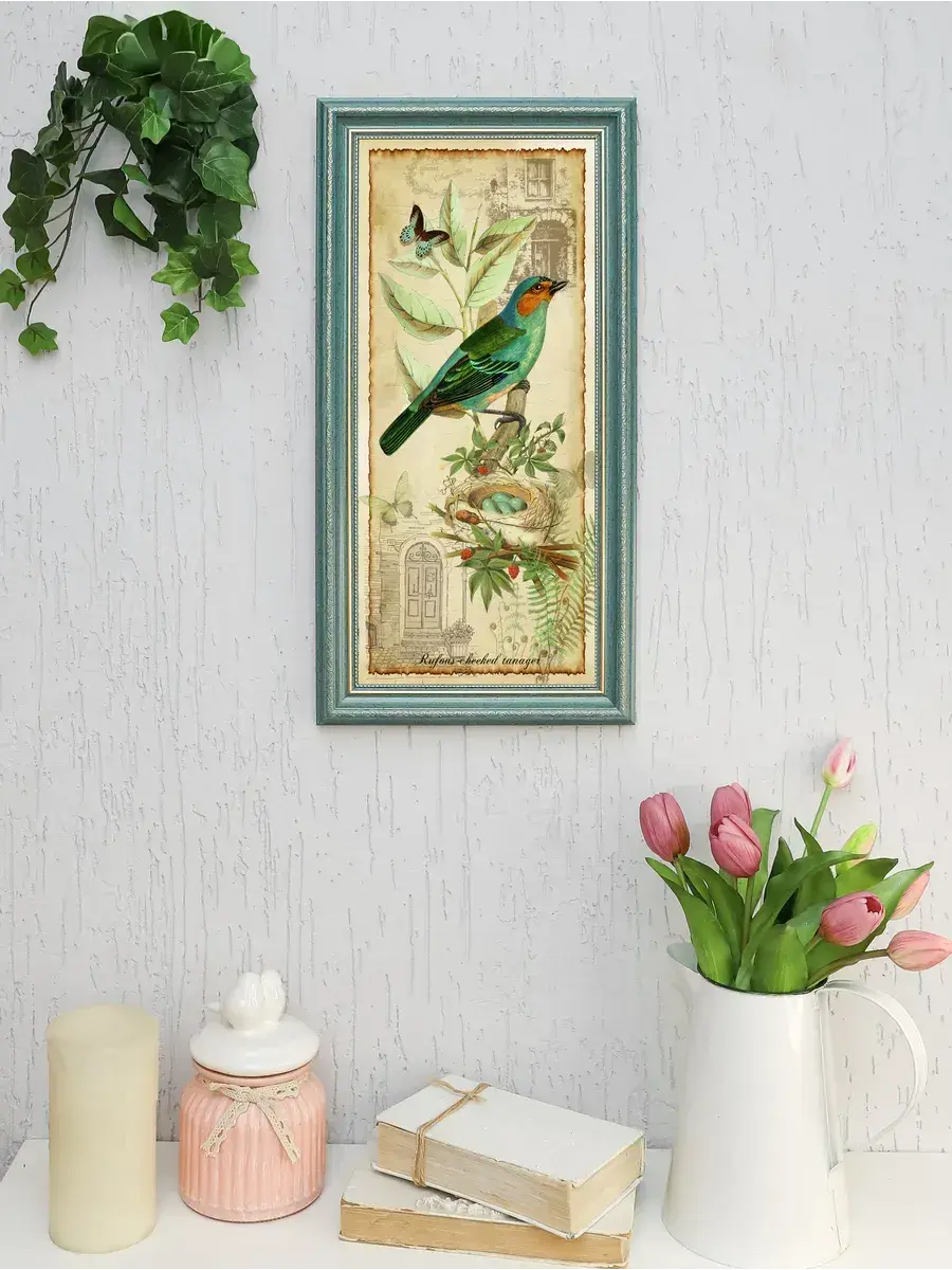 Напечатанная на натуральном хлопковом холсте и оформленная в элегантную рамку с бирюзового цвета с позолотой, эта картина добавляет нотку артистизма как в современный, так и в классический интерьер. Символ свободы, изображенный на полотне — птицы — делает её особенно привлекательной для любителей природы. Кроме того, она станет прекрасным элементом в офисе, создавая атмосферу уюта и комфорта.