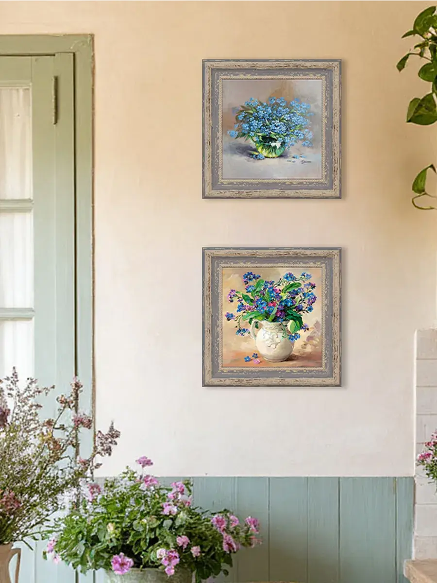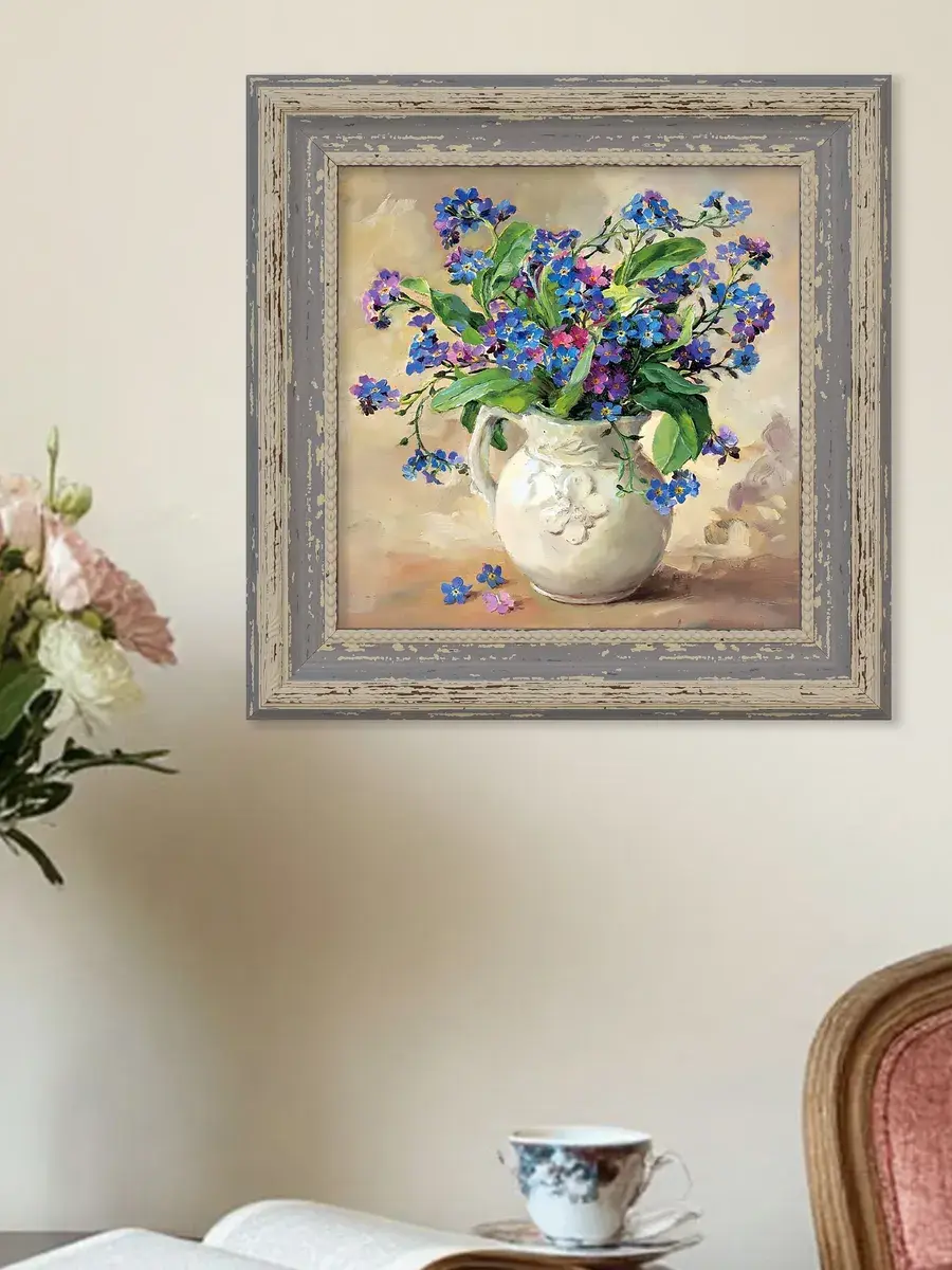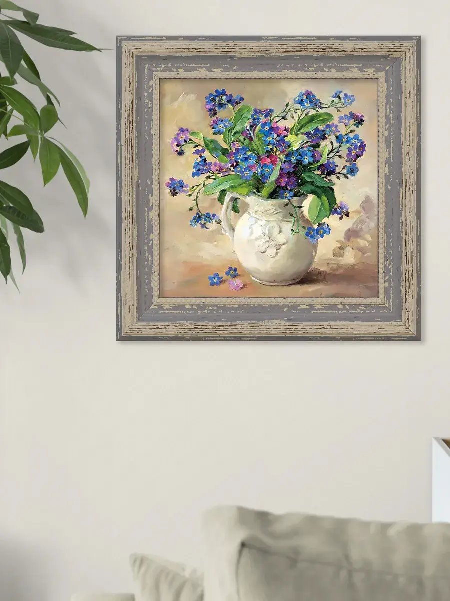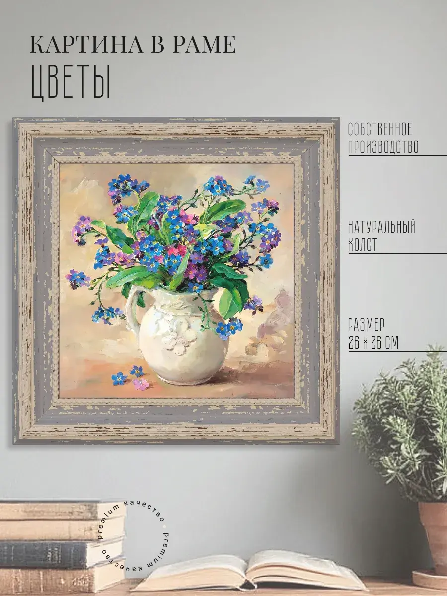 Картина напечатана на натуральном холсте, покрыта лаком. Основа из ХДФ, что исключает провисание холста. Багетная рама по периметру картины. Размер картины в раме 26*26 см. Разнообразие сюжетов для создания домашних коллекций. Рама с эффектом старины лавандового цвета.