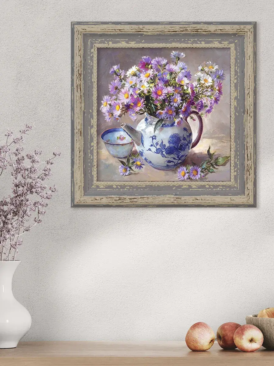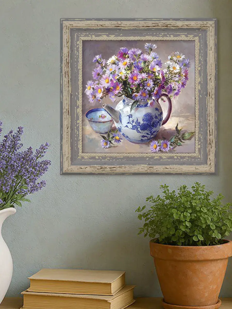 Винтажная рама лавандового цвета придает картине законченный вид.