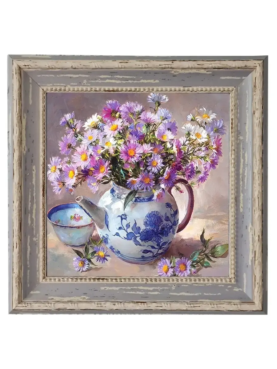 Картина напечатана на натуральном холсте, покрыта лаком. Основа из ХДФ, что исключает провисание холста. Багетная рама по периметру картины. Размер картины в раме 26*26 см. Разнообразие сюжетов для создания домашних коллекций. Рама с эффектом старины лавандового цвета.