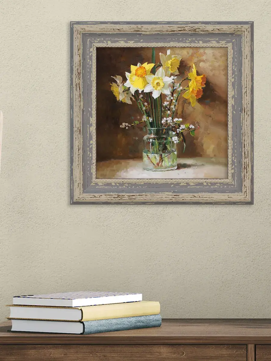 Картина напечатана на натуральном холсте, покрыта лаком. Основа из ХДФ, что исключает провисание холста. Багетная рама по периметру картины. Размер картины в раме 26*26 см. Разнообразие сюжетов для создания домашних коллекций. Рама с эффектом старины лавандового цвета.