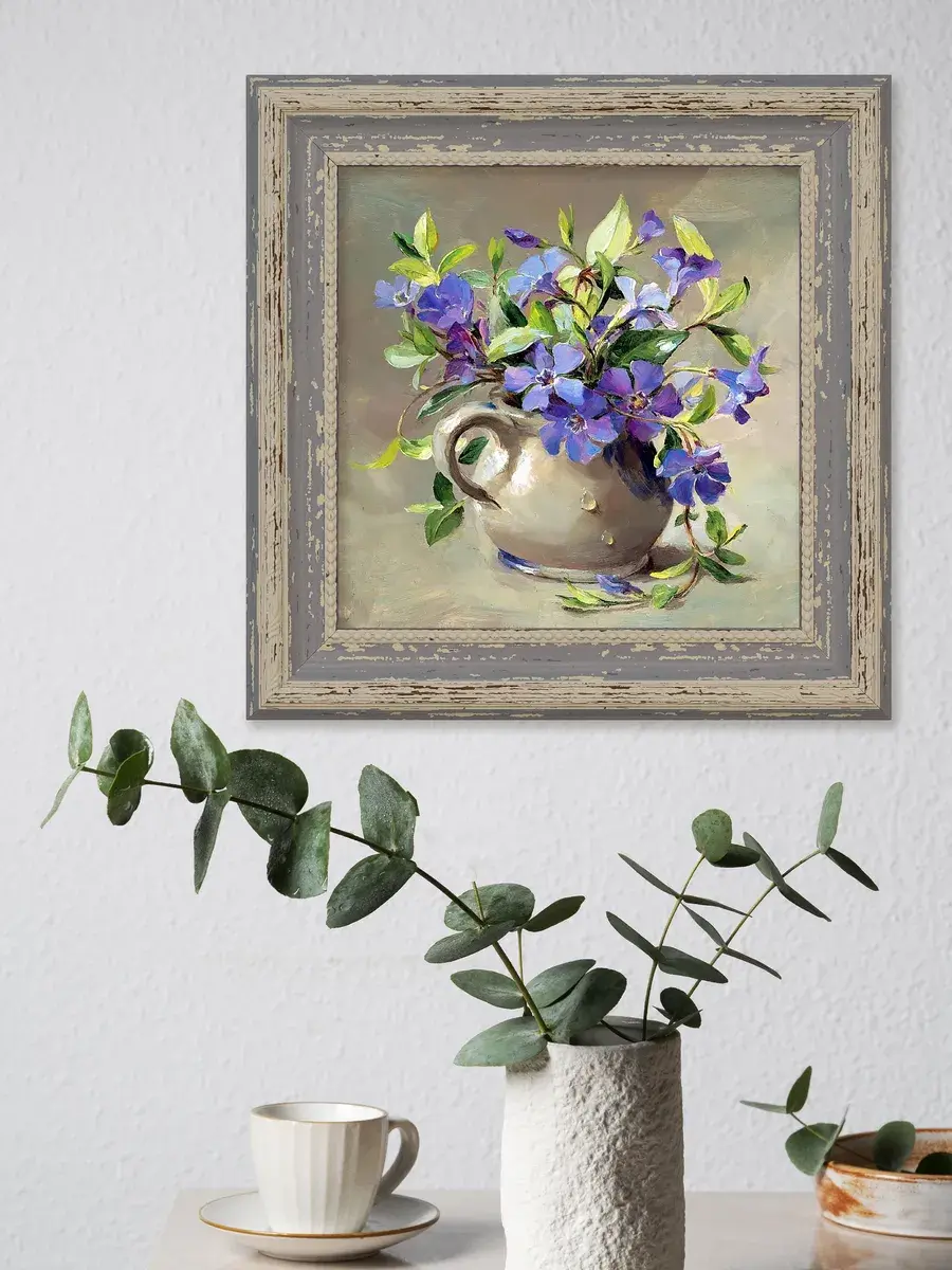 Винтажная рама лавандового цвета придает картине законченный вид.