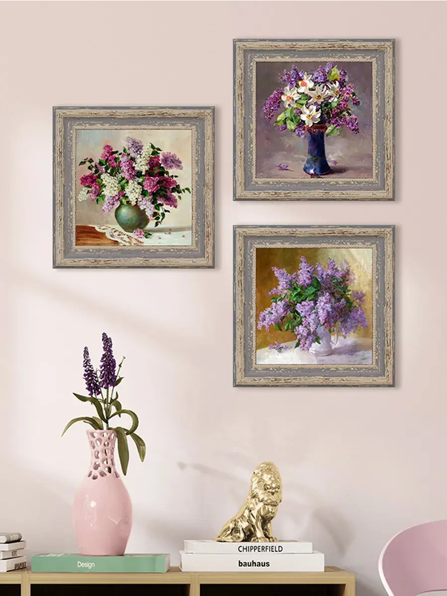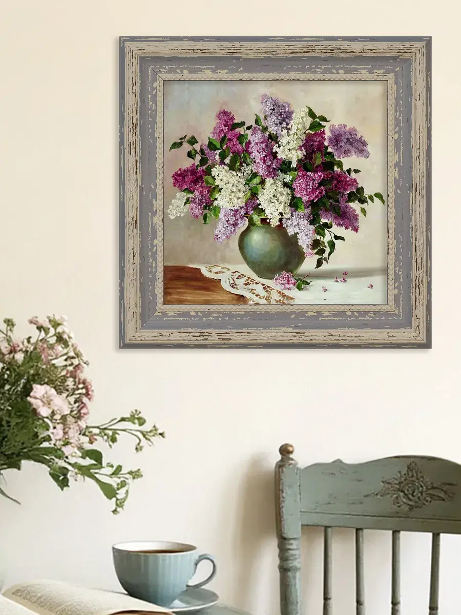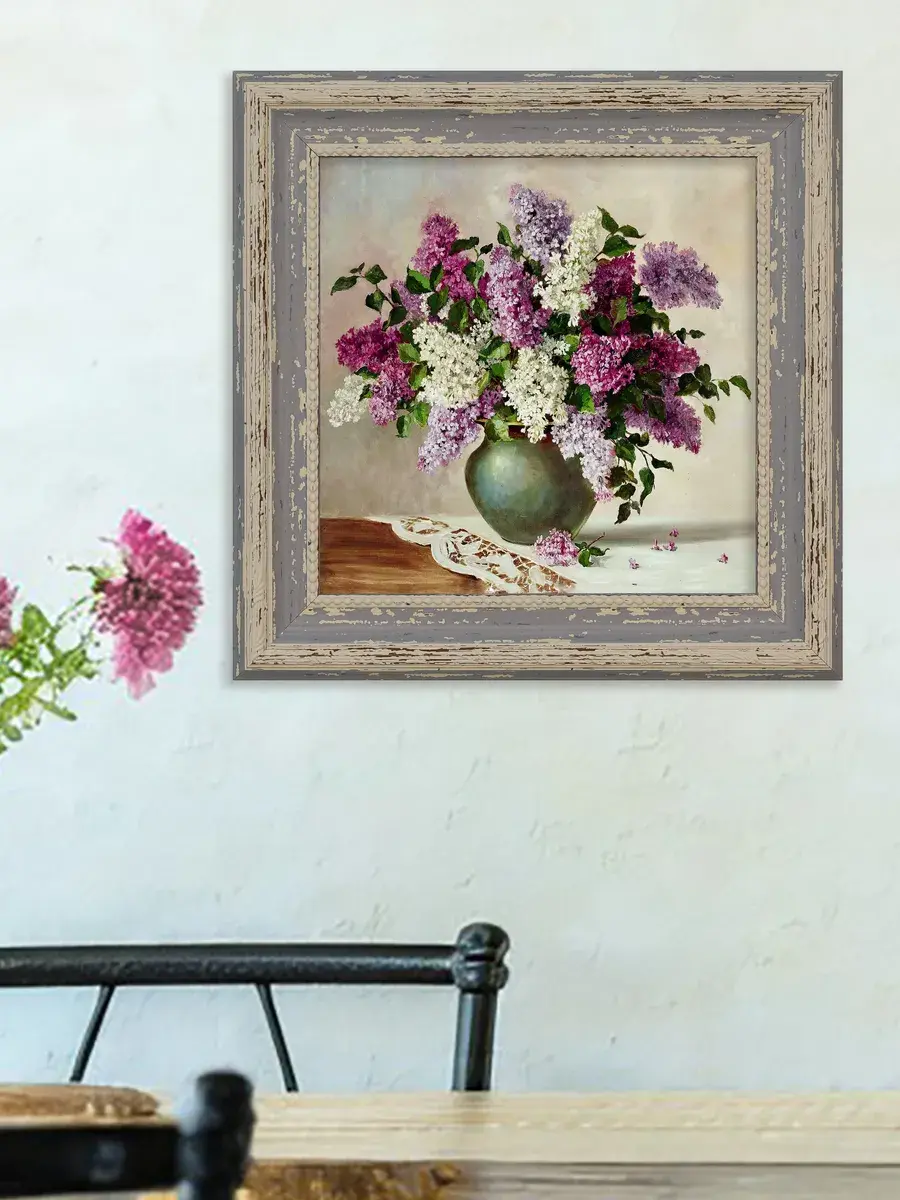 Винтажная рама лавандового цвета придает картине законченный вид.