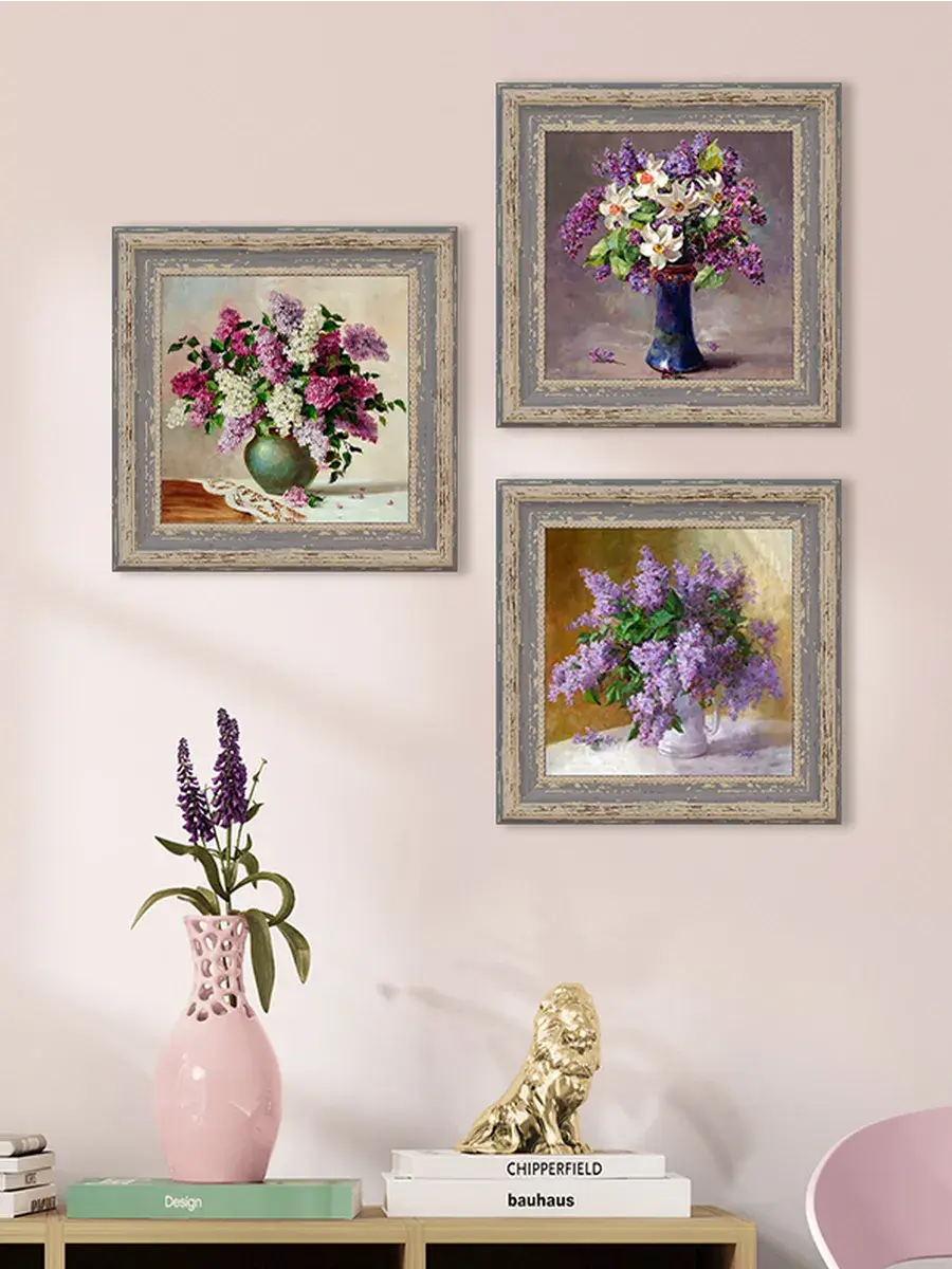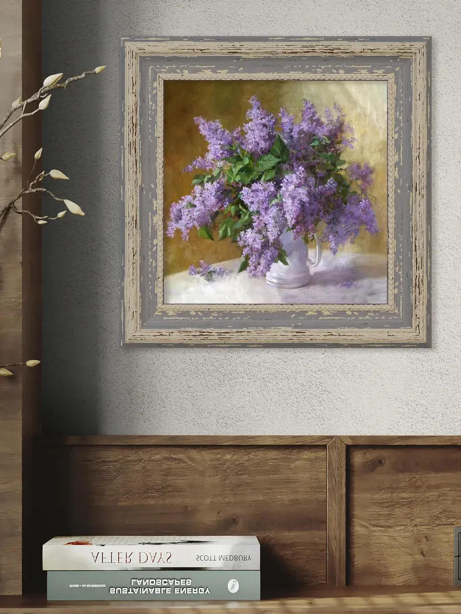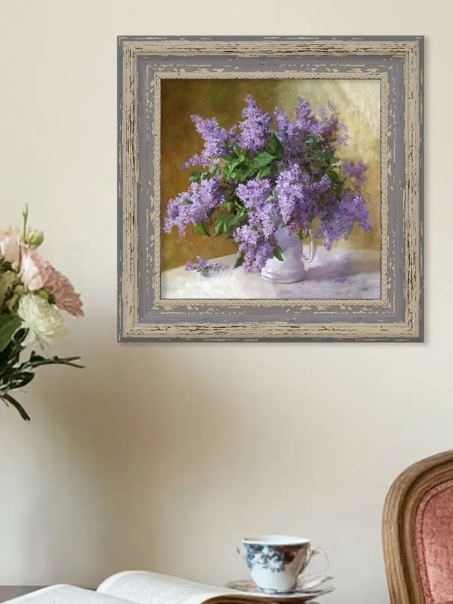Картина напечатана на натуральном холсте, покрыта лаком. Основа из ХДФ, что исключает провисание холста. Багетная рама по периметру картины. Размер картины в раме 26*26 см. Разнообразие сюжетов для создания домашних коллекций. Рама с эффектом старины лавандового цвета.