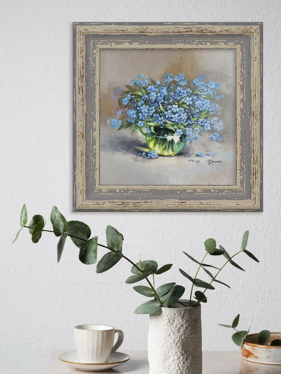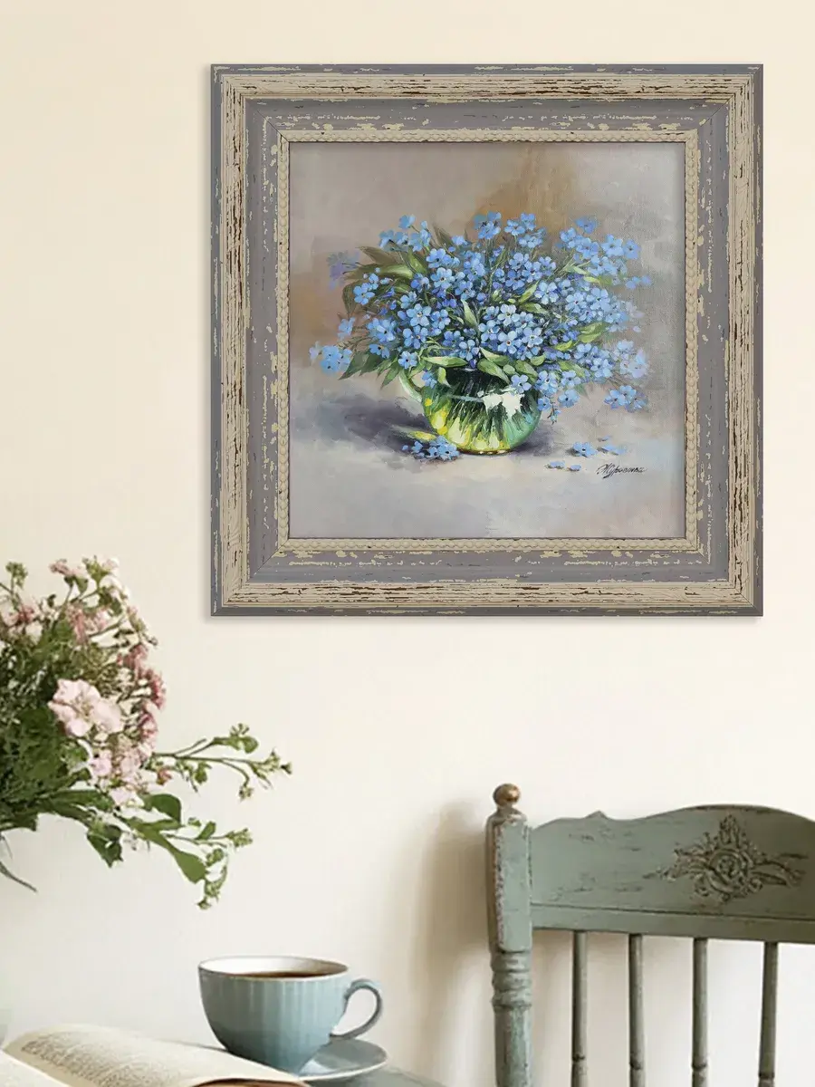 Картина напечатана на натуральном холсте, покрыта лаком. Основа из ХДФ, что исключает провисание холста. Багетная рама по периметру картины. Размер картины в раме 26*26 см. Разнообразие сюжетов для создания домашних коллекций. Рама с эффектом старины лавандового цвета.