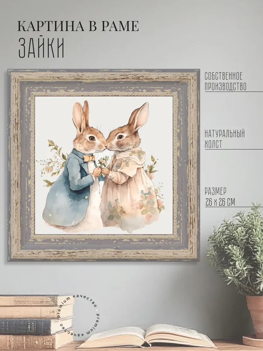 Картина напечатана на натуральном холсте, покрыта лаком. Основа из ХДФ, что исключает провисание холста. Багетная рама по периметру картины. Размер картины в раме 26*26 см. Разнообразие сюжетов для создания домашних коллекций. Рама с эффектом старины лавандового цвета.