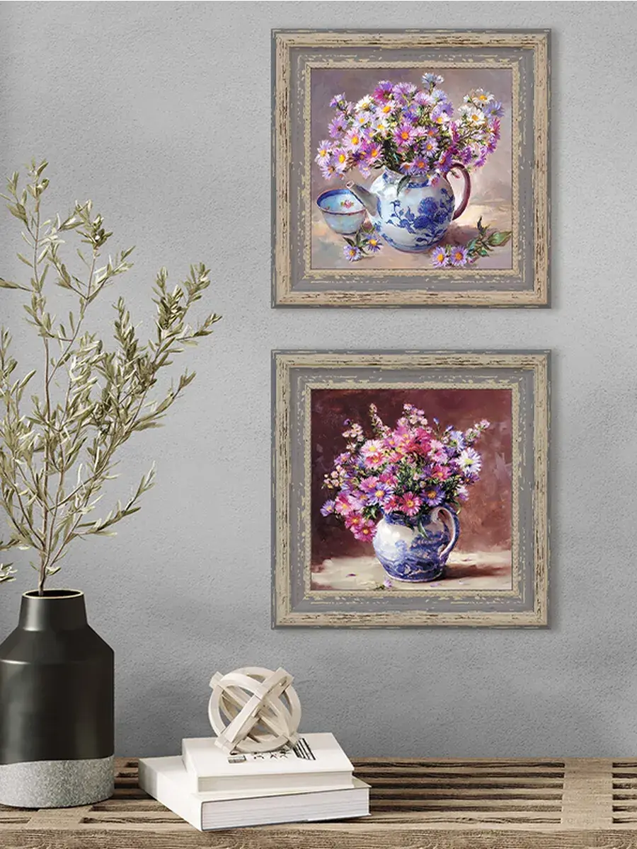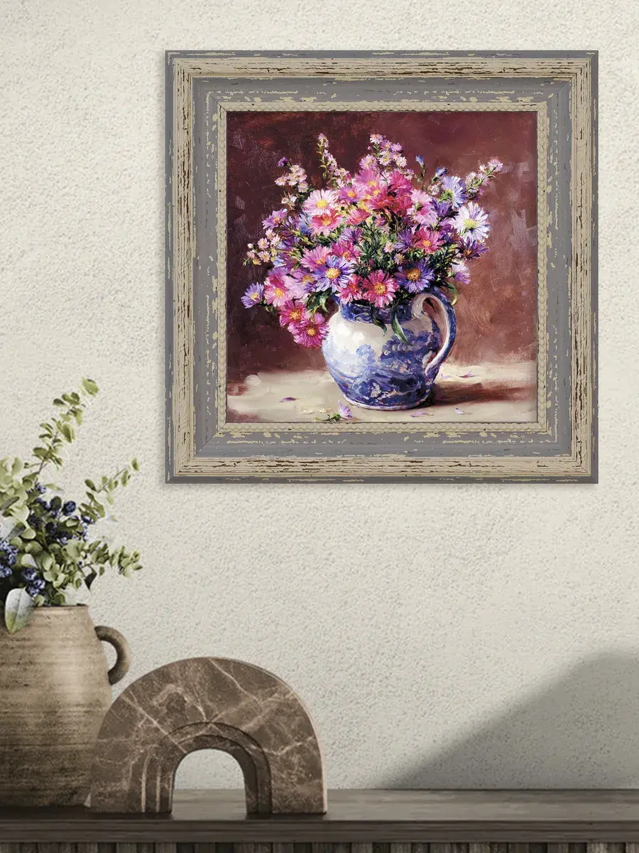 Картина напечатана на натуральном холсте, покрыта лаком. Основа из ХДФ, что исключает провисание холста. Багетная рама по периметру картины. Размер картины в раме 26*26 см. Разнообразие сюжетов для создания домашних коллекций. Рама с эффектом старины лавандового цвета.