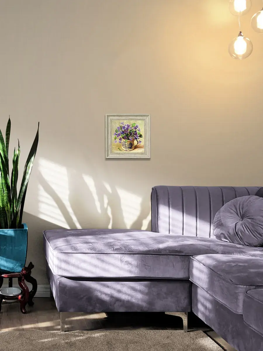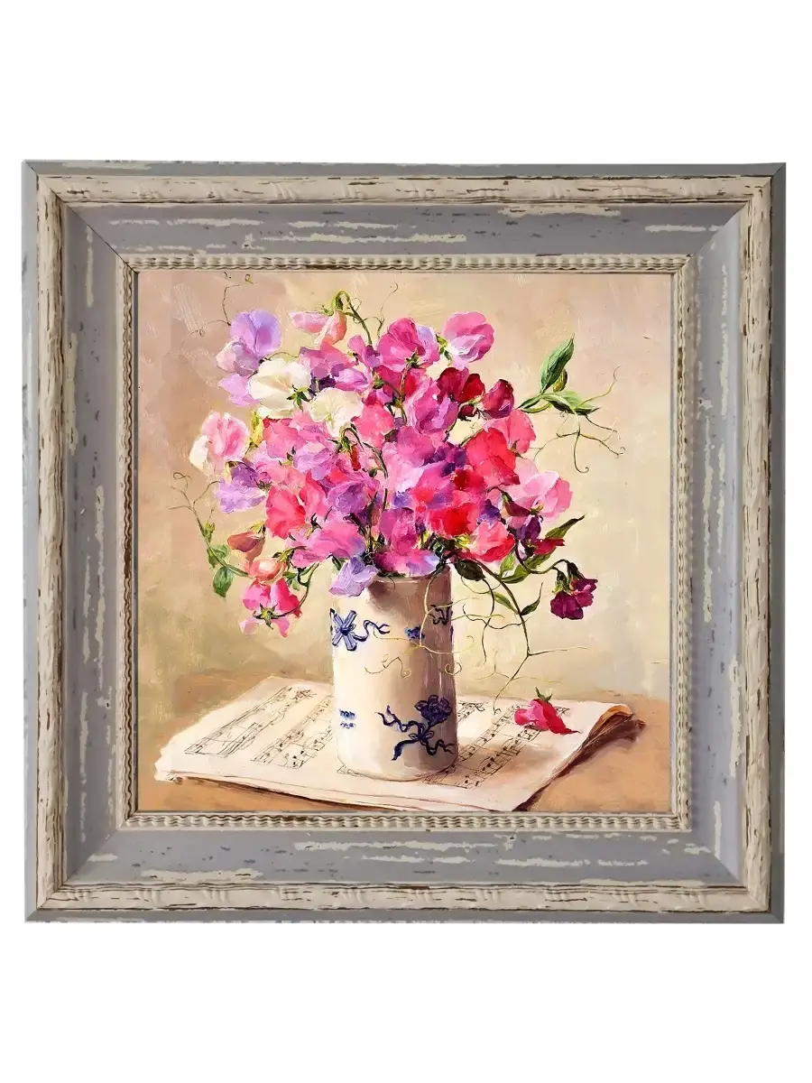 Картина напечатана на натуральном холсте, покрыта лаком. Основа из ХДФ, что исключает провисание холста. Багетная рама по периметру картины. Размер картины в раме 26*26 см. Разнообразие сюжетов для создания домашних коллекций. Рама с эффектом старины лавандового цвета.