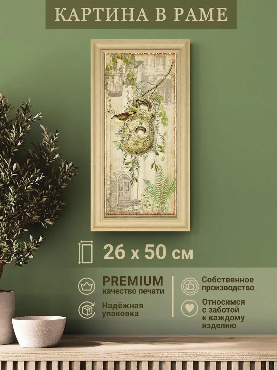 Картина напечатана на натуральном холсте в галерейном качестве, покрыта лаком. Для защиты от провисания холст наклеен на хдф. Рама широкая из полиуретана, матовая по дерево. Картина настенная, готовая, в раме. Крепление для стены в комплекте.