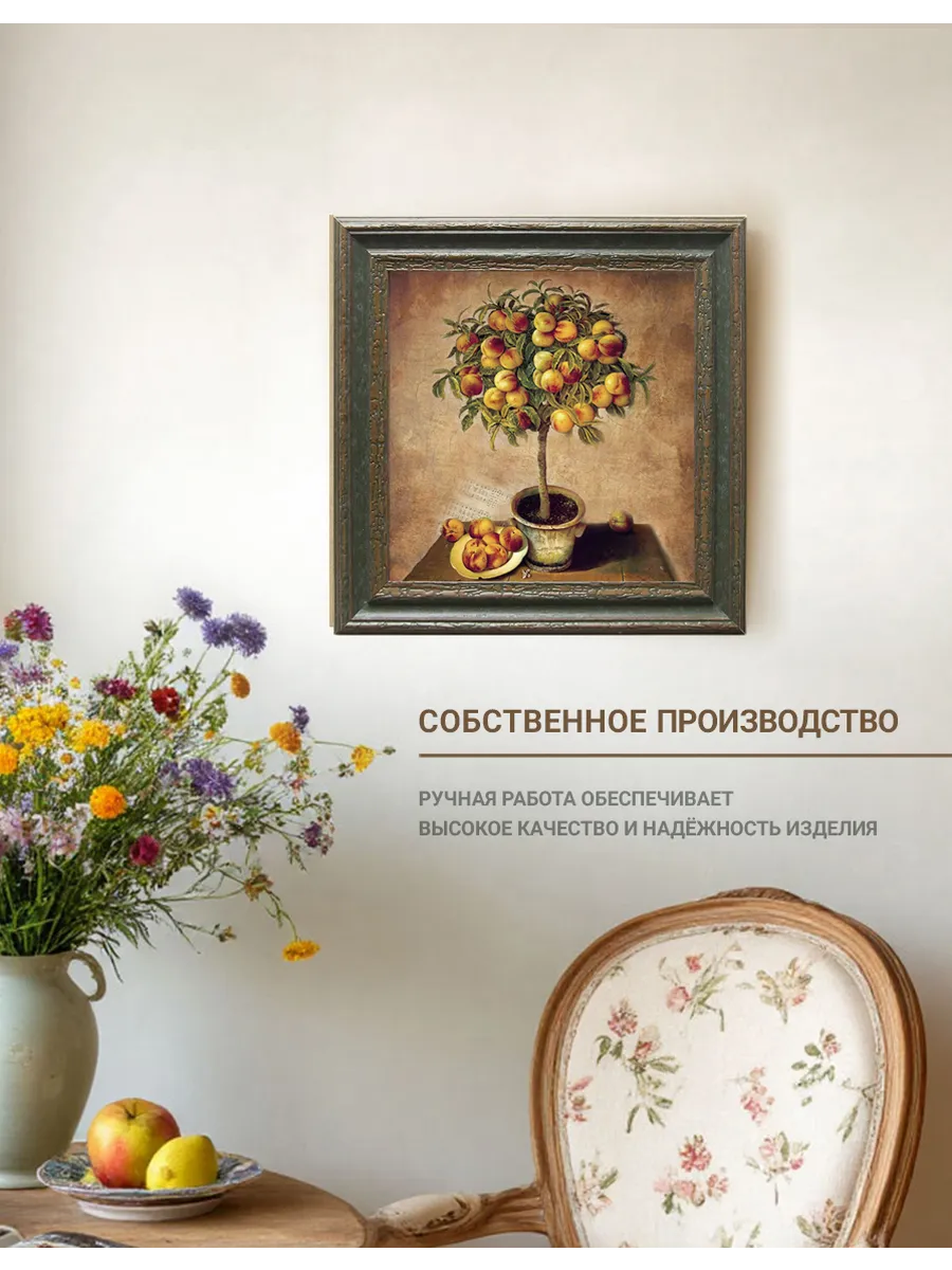 Картина органично смотрится сама по себе, в паре, а также в композиции всей коллекции. Картина напечатана на натуральном холсте, покрыта лаком. Для защиты от провисания холст наклеен на хдф. Рама из полиуретана матовая, благородного зеленого цвета "под дерево". Размера холст 20*20 см, размер картины с рамой 26х26 см.