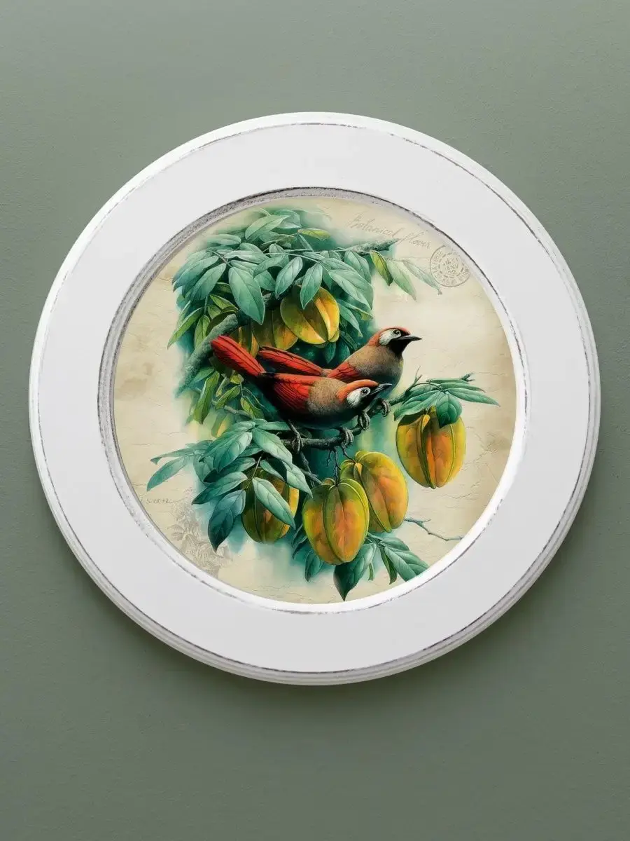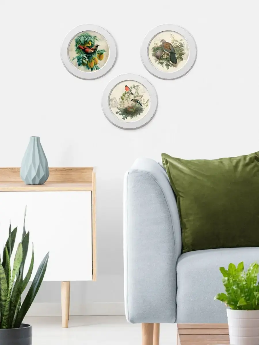 Настенный декор в нежных пастельных тонах с изящными птичками в белой раме с эффектом старения (патина коричневого цвета). Картина напечатана на натуральном холсте, покрыта матовым лаком. Настенная картина в круглой раме станет прекрасным украшением интерьера. Множество вариантов дает возможность создать собственную коллекцию картин с птичками.
