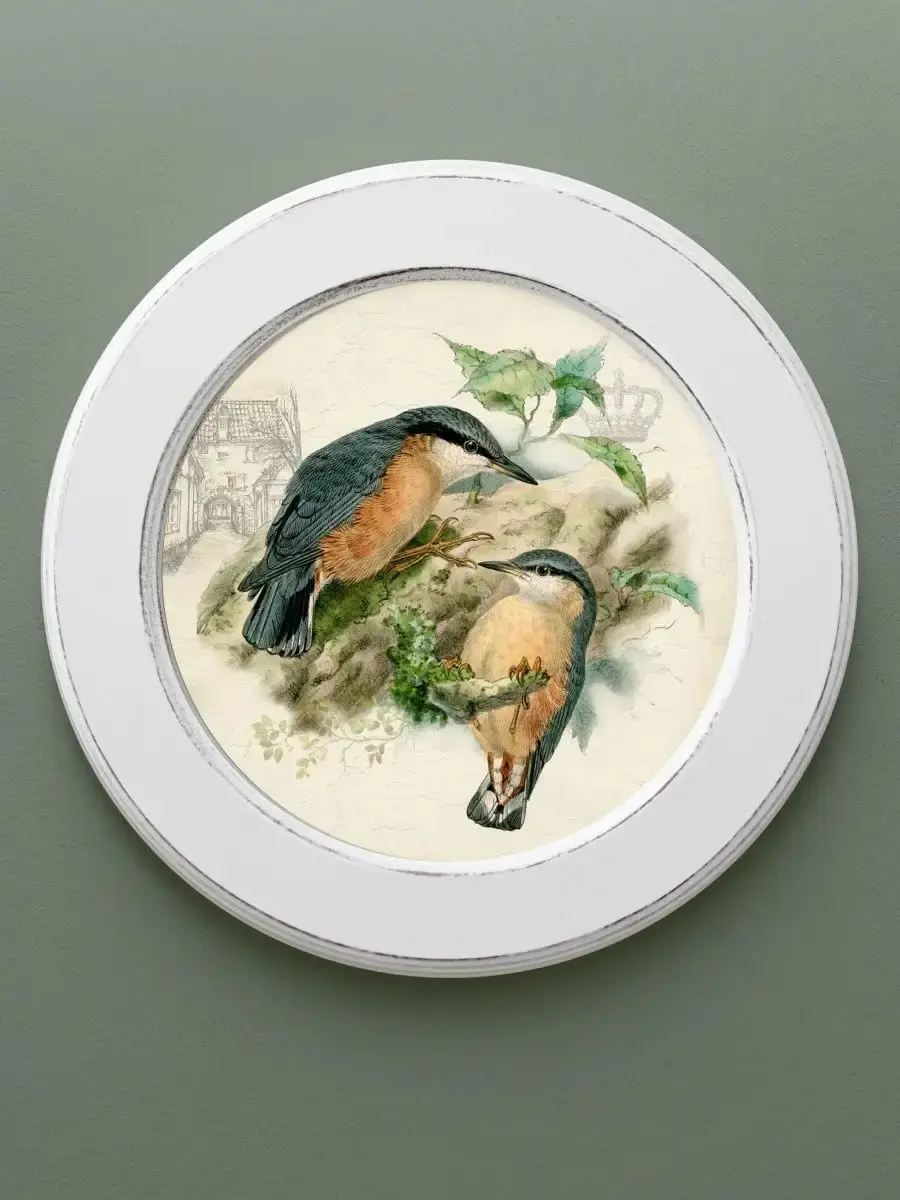 Настенный декор в нежных пастельных тонах с изящными птичками в белой раме с эффектом старения (патина коричневого цвета). Картина напечатана на натуральном холсте, покрыта матовым лаком. Настенная картина в круглой раме станет прекрасным украшением интерьера. Множество вариантов дает возможность создать собственную коллекцию картин с птичками.