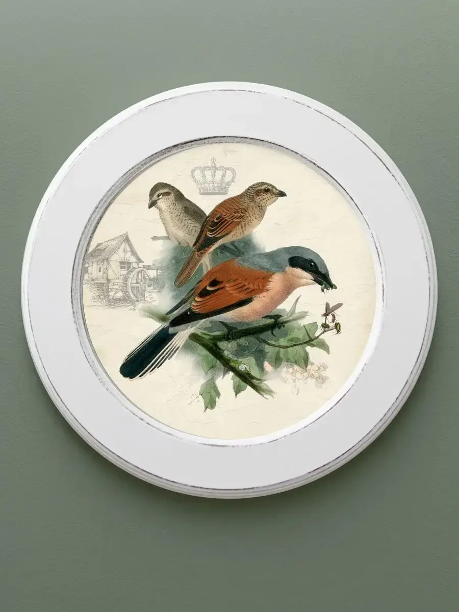 Настенный декор в нежных пастельных тонах с изящными птичками в белой раме с эффектом старения (патина коричневого цвета). Картина напечатана на натуральном холсте, покрыта матовым лаком. Настенная картина в круглой раме станет прекрасным украшением интерьера. Множество вариантов дает возможность создать собственную коллекцию картин с птичками.