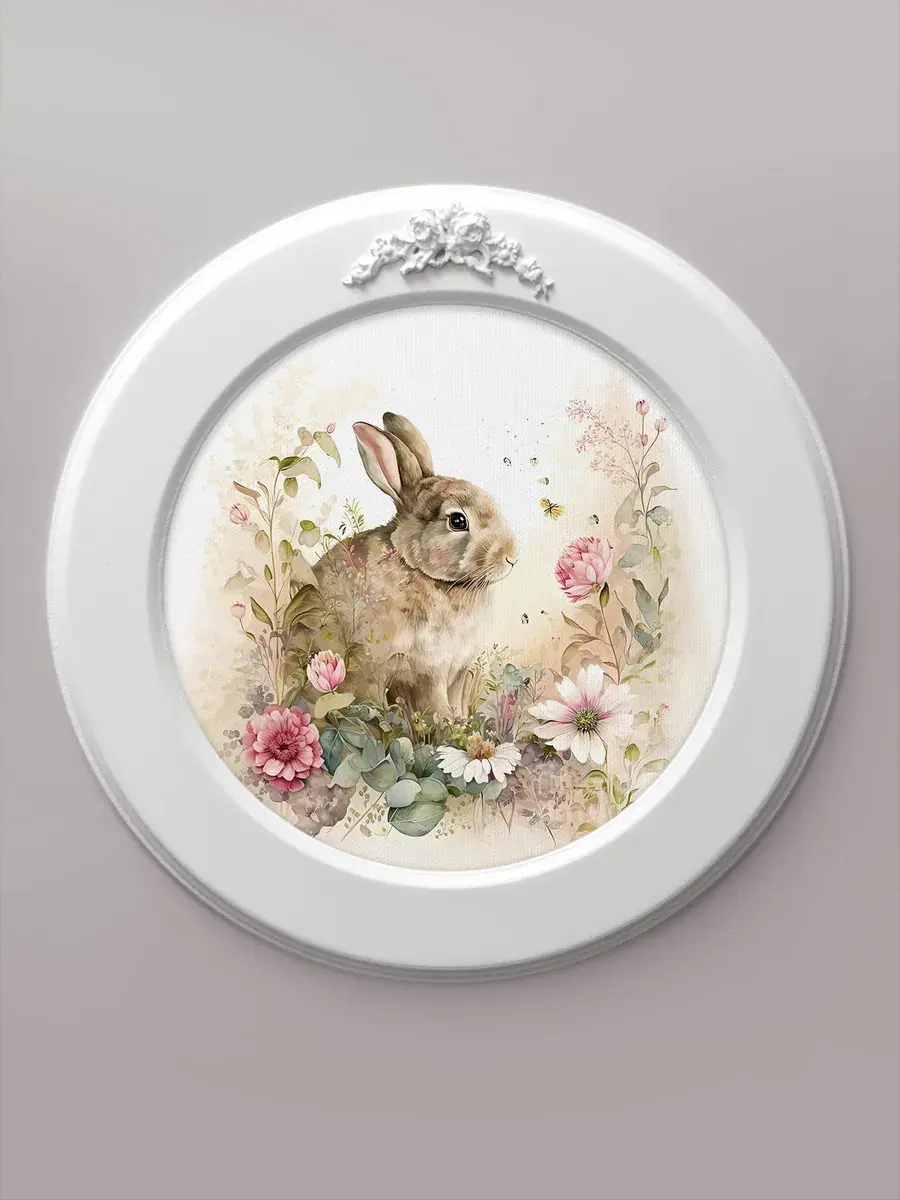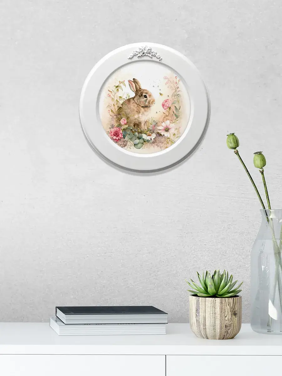 Настенный декор в нежных пастельный тонах с милыми зайчиками в белой раме с лепниной.