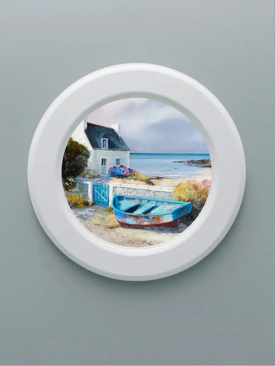 Настенный декор в нежных пастельный тонах в морской тематике в белоснежной раме. Картина напечатана на натуральном холсте, покрыта матовым лаком в круглой белой раме станет прекрасным украшением интерьера.
