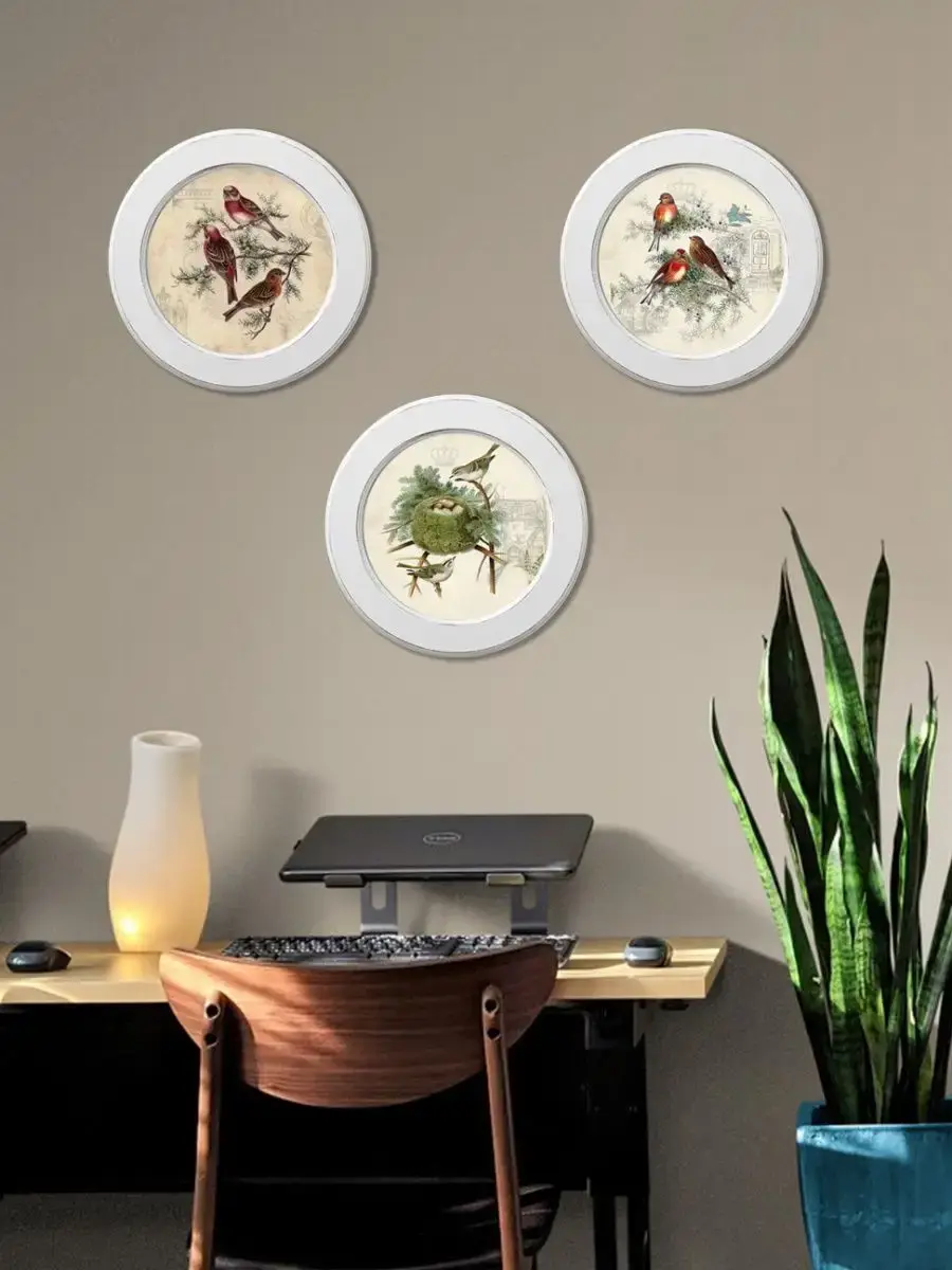 Настенный декор в нежных пастельных тонах с изящными птичками в белой раме с эффектом старения (патина коричневого цвета). Картина напечатана на натуральном холсте, покрыта матовым лаком. Настенная картина в круглой раме станет прекрасным украшением интерьера. Множество вариантов дает возможность создать собственную коллекцию картин с птичками.