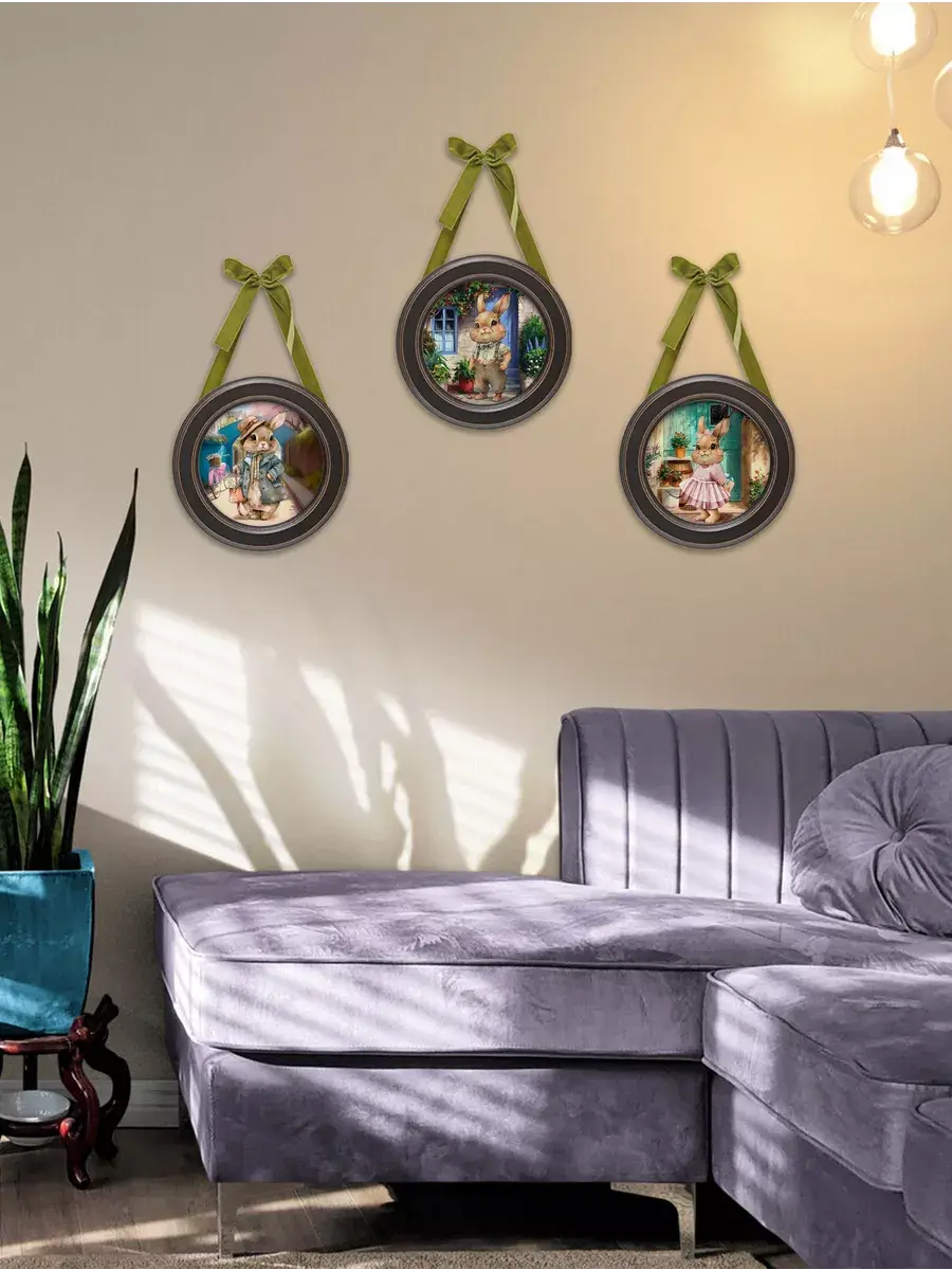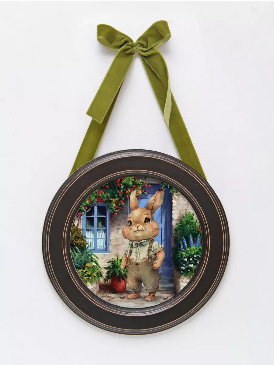 Настенный декор в нежных пастельных тонах с милыми зайчиками в раме приятного шоколадно-коричневого цвета. Бархатная лента благородного зеленого цвета добавляет картине изысканности. Картина напечатана на натуральном холсте, покрыта матовым лаком станет прекрасным дополнением и украшением интерьера.