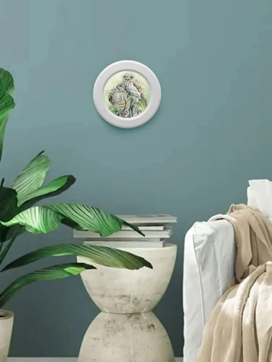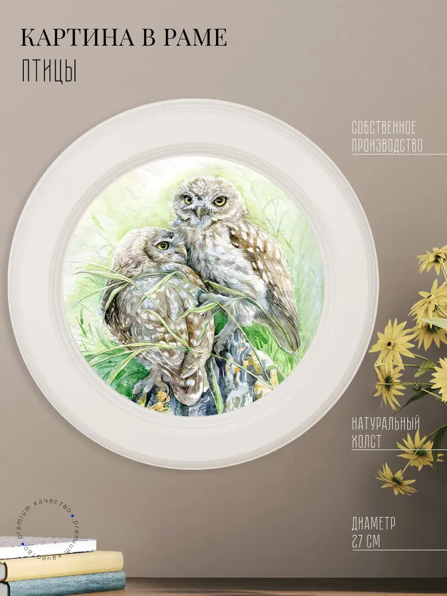 Настенный декор в нежных пастельный тонах с изящными птичками в белоснежной раме. Картина напечатана на натуральном холсте, покрыта матовым лаком в круглой белой раме станет прекрасным украшением интерьера. Множество вариантов дает возможность создать собственную коллекцию. Картины с птичками прекрасный подарок родным и знакомым. Настенные панно с изображением птиц для украшения дома и дачи, добавят уюта на кухне, гостиной, прихожей и в детской комнате. Рама изготовлена из цельного листа МДФ 16 мм, не имеет зазоров и стыков. Окрашена экологичной акриловой эмалью в белый цвет. Диаметр картины 27 см, диаметр изображения 19 см. Крепление для стены в комплекте.