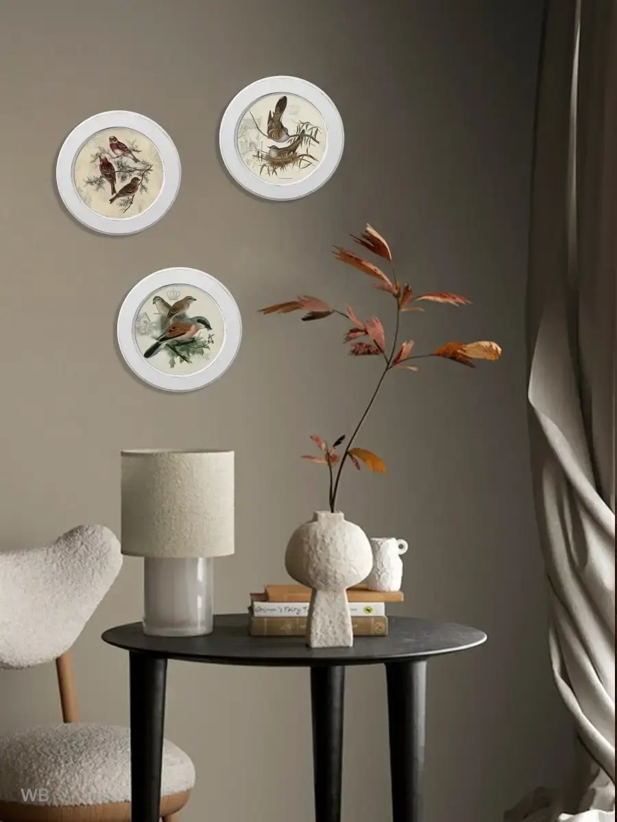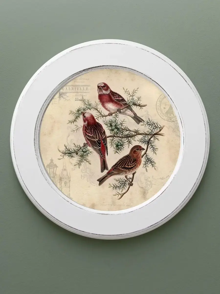 Настенный декор в нежных пастельных тонах с изящными птичками в белой раме с эффектом старения (патина коричневого цвета). Картина напечатана на натуральном холсте, покрыта матовым лаком. Настенная картина в круглой раме станет прекрасным украшением интерьера. Множество вариантов дает возможность создать собственную коллекцию картин с птичками.