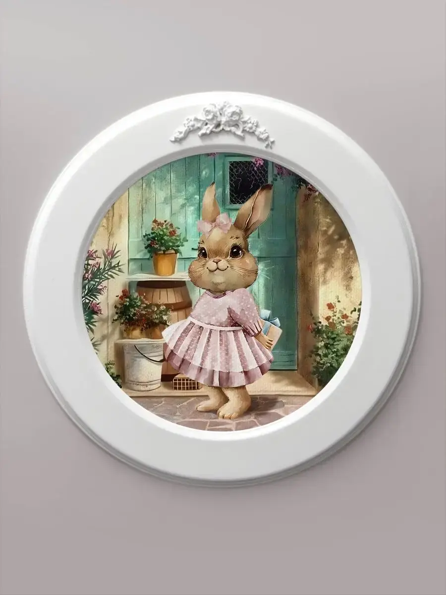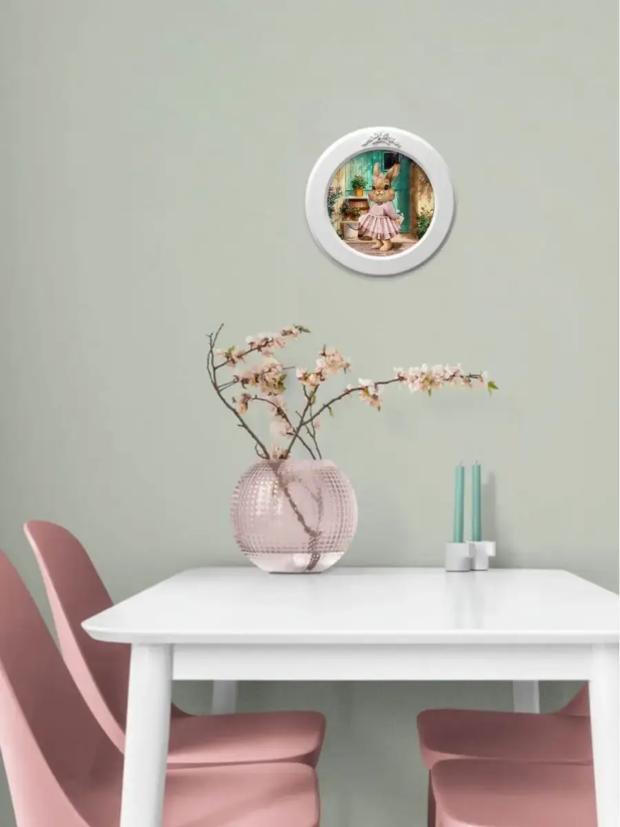 Настенный декор в нежных пастельный тонах с милыми зайчиками в белой раме с лепниной.