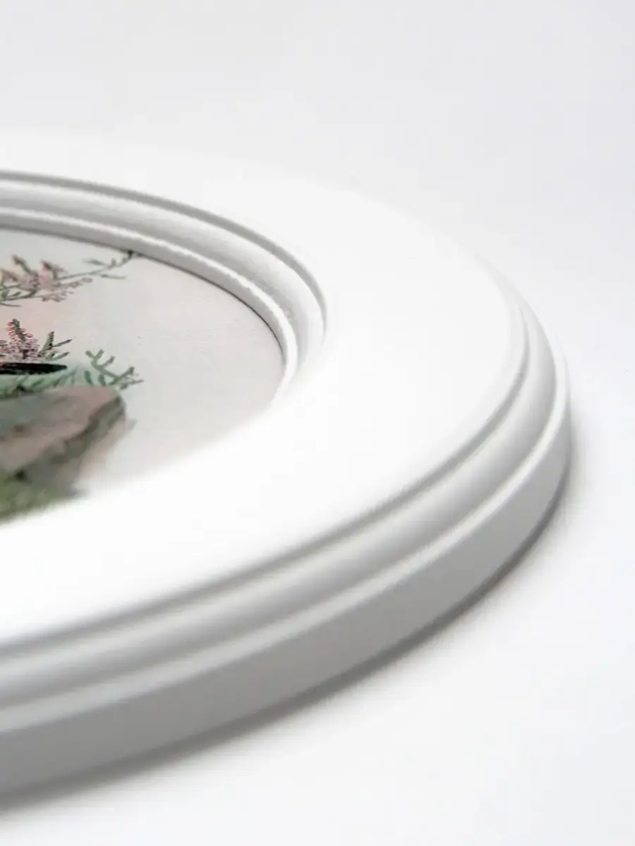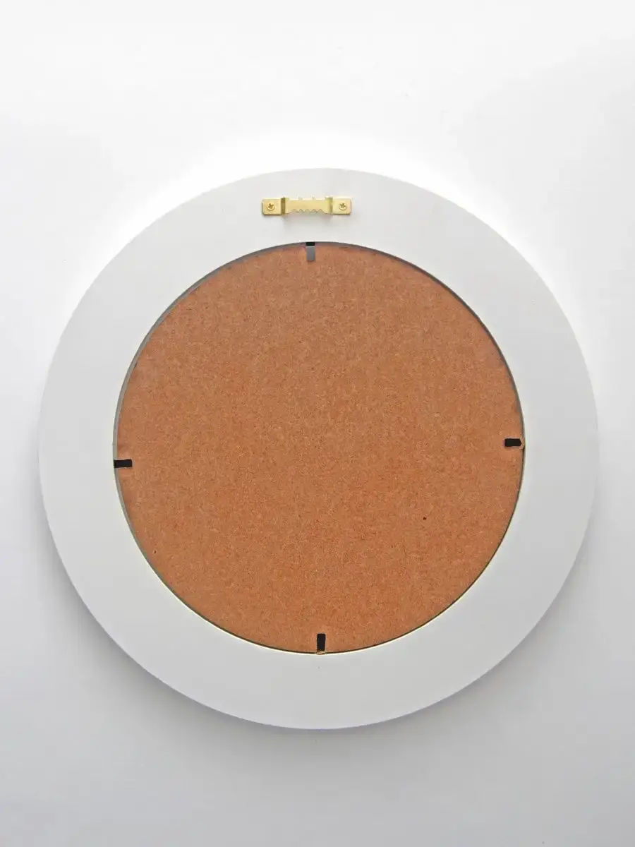 Рама изготовлена из цельного листа МДФ 16 мм, не имеет зазоров и стыков. Окрашена экологичной акриловой эмалью в белый цвет. Диаметр картины 27 см, диаметр изображения 19 см. Крепление для стены в комплекте.