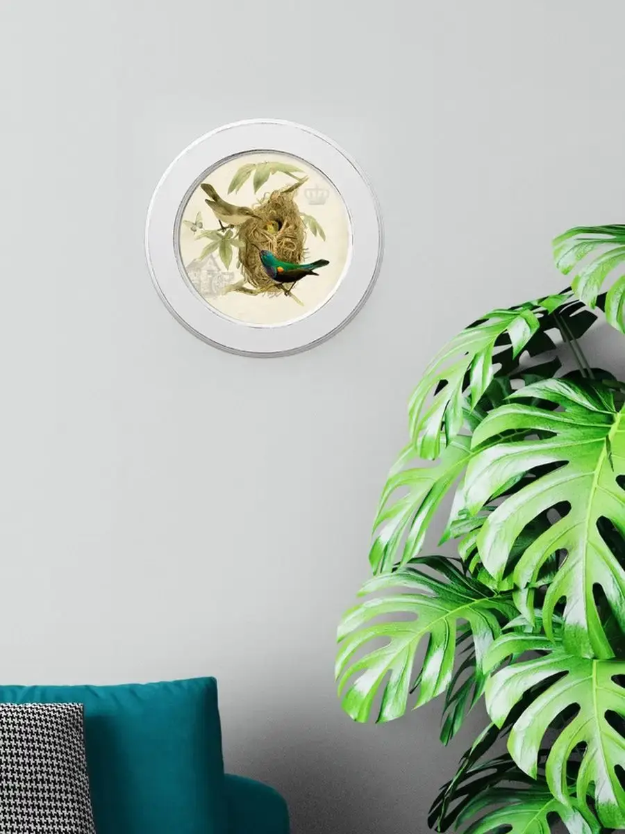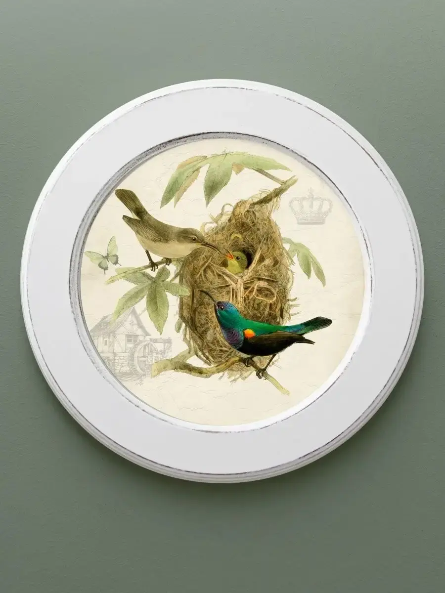 Настенный декор в нежных пастельных тонах с изящными птичками в белой раме с эффектом старения (патина коричневого цвета). Картина напечатана на натуральном холсте, покрыта матовым лаком. Настенная картина в круглой раме станет прекрасным украшением интерьера. Множество вариантов дает возможность создать собственную коллекцию картин с птичками.