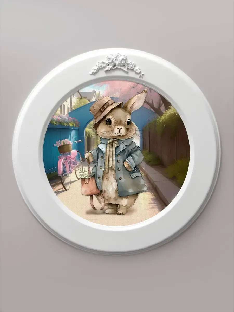 Настенный декор в нежных пастельный тонах с милыми зайчиками в белой раме с лепниной.