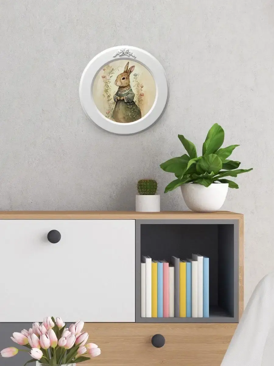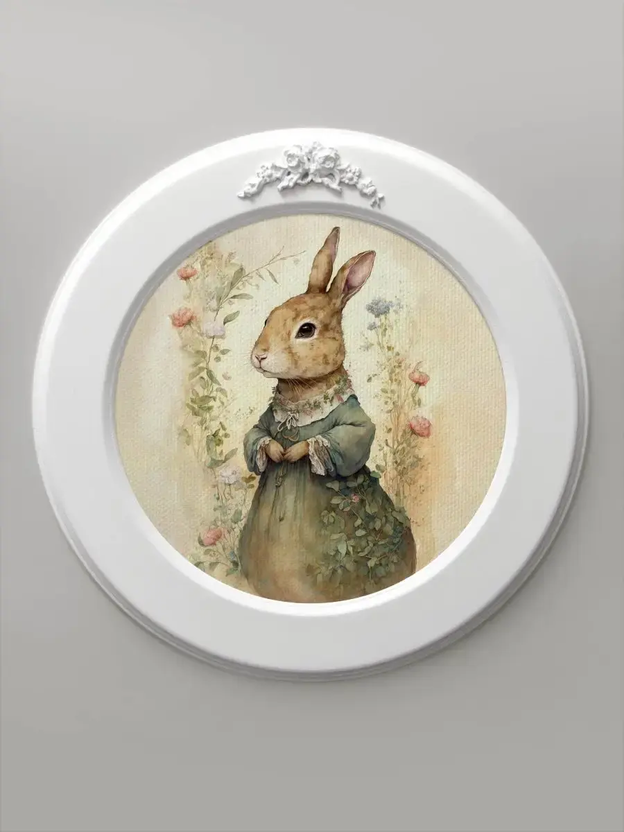 Настенный декор в нежных пастельный тонах с милыми зайчиками в белой раме с лепниной.