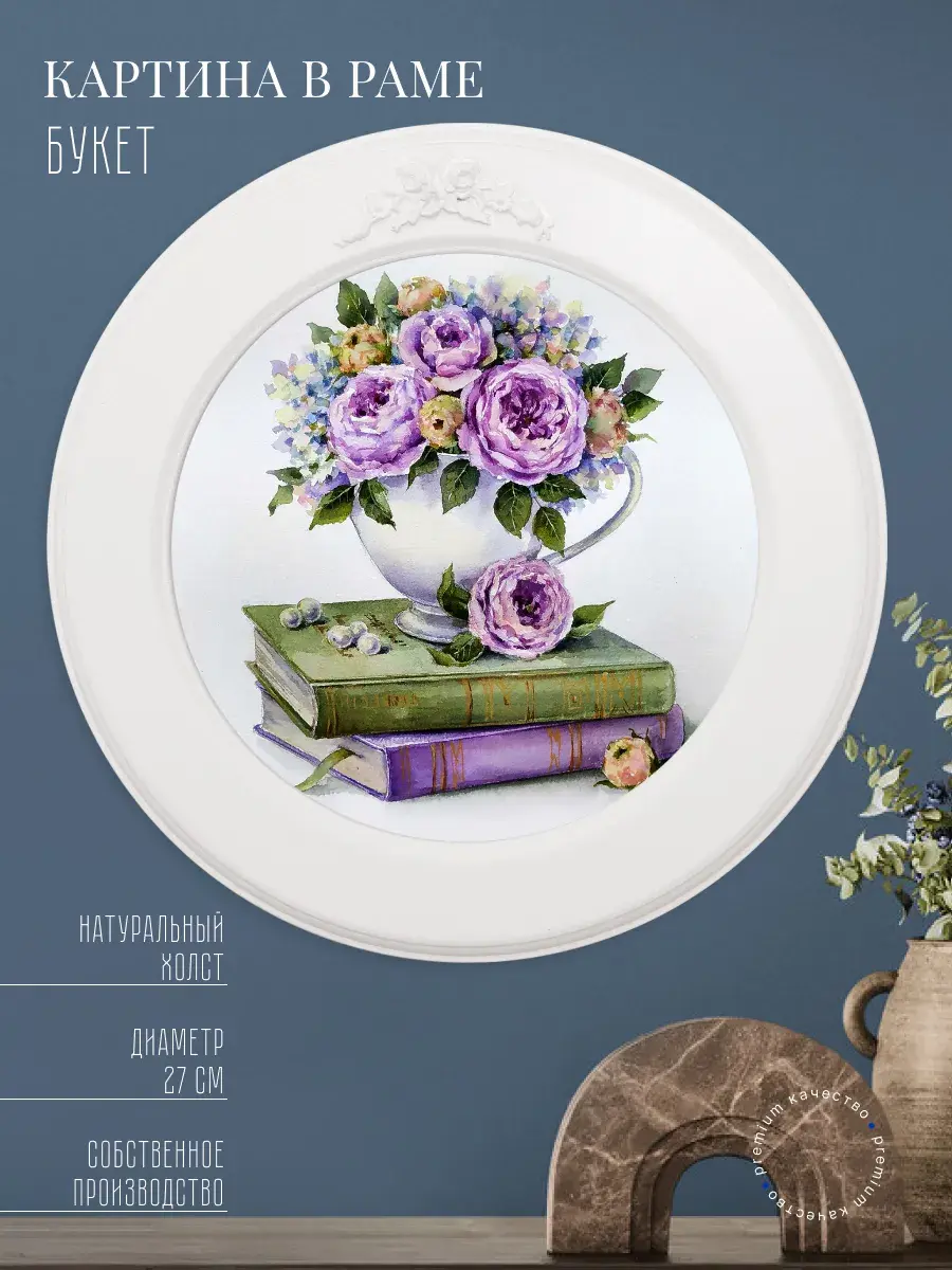Картина напечатана на натуральном холсте, покрыта матовым лаком в круглой белой раме, станет прекрасным украшением интерьера. Множество вариантов дает возможность создать собственную коллекцию. Рама изготовлена из цельного листа МДФ 10 мм, не имеет зазоров и стыков. Окрашена экологичной акриловой эмалью в белый цвет. Крепление для стены в комплекте.