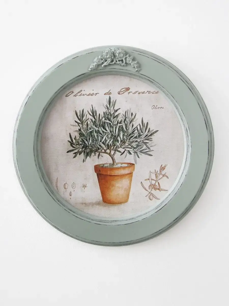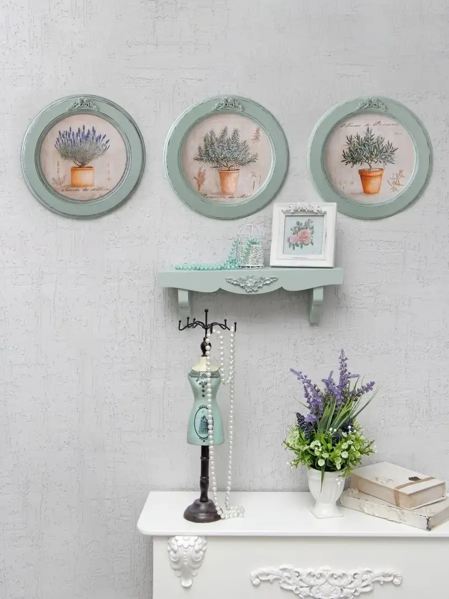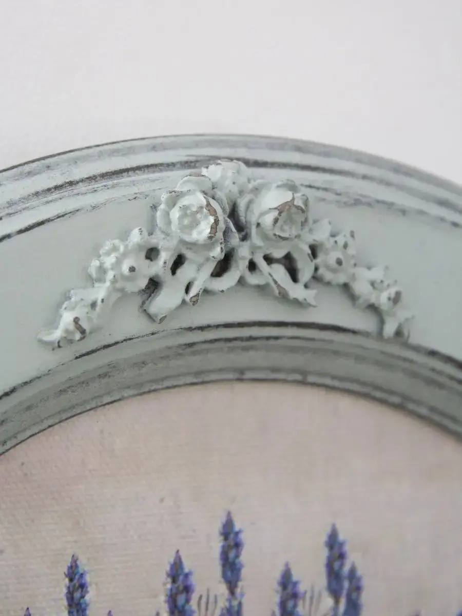 Настенный декор в нежных пастельный тонах в мятной раме с лепниной с эффектом состаривания. Картина в стиле Прованс напечатана на натуральном холсте, покрыта матовым лаком в круглой раме мятного цвета станет прекрасным украшением интерьера. Множество вариантов дает возможность создать собственную коллекцию. Настенные картины с изображением лаванды для украшения дома и дачи, добавят уюта на кухне, гостиной, прихожей и в детской комнате. Рама изготовлена из цельного листа МДФ 16 мм, не имеет зазоров и стыков. Окрашена экологичной акриловой эмалью в мятный цвет, состарена вручную. Диаметр картины 27 см, диаметр изображения 19 см. Крепление для стены в комплекте.