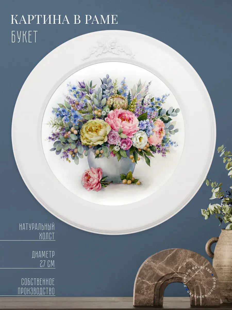 Картина напечатана на натуральном холсте, покрыта матовым лаком в круглой белой раме, станет прекрасным украшением интерьера. Множество вариантов дает возможность создать собственную коллекцию. Рама изготовлена из цельного листа МДФ 10 мм, не имеет зазоров и стыков. Окрашена экологичной акриловой эмалью в белый цвет. Крепление для стены в комплекте.