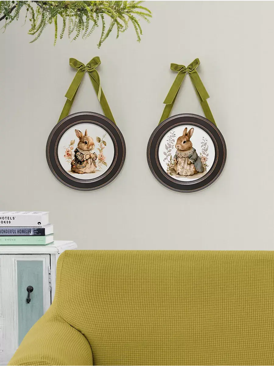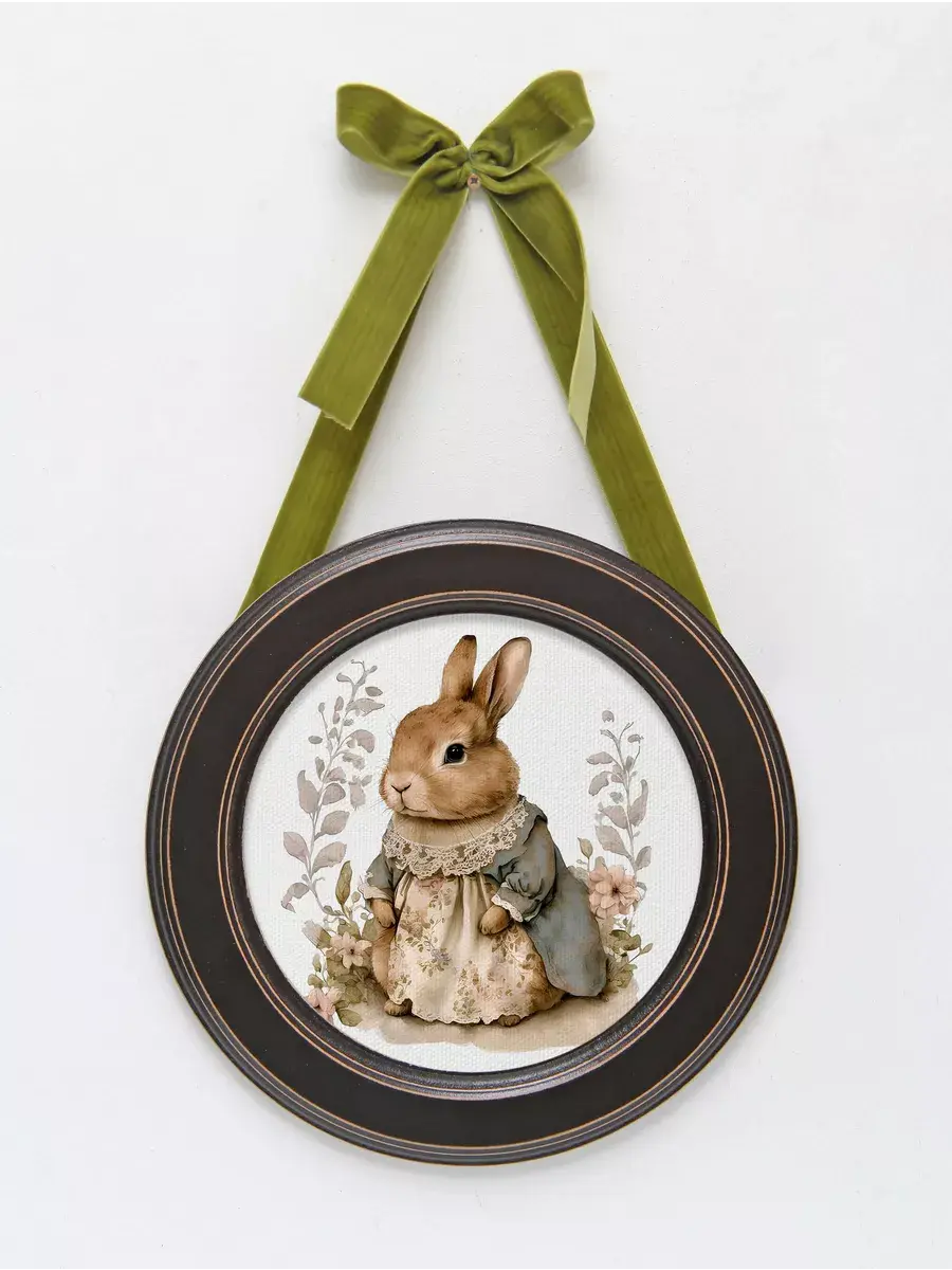 Настенный декор в нежных пастельных тонах с милыми зайчиками в раме приятного шоколадно-коричневого цвета. Бархатная лента благородного зеленого цвета добавляет картине изысканности. Картина напечатана на натуральном холсте, покрыта матовым лаком станет прекрасным дополнением и украшением интерьера.