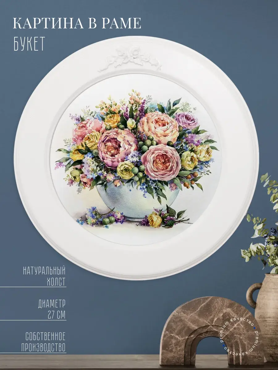 Картина напечатана на натуральном холсте, покрыта матовым лаком в круглой белой раме, станет прекрасным украшением интерьера. Множество вариантов дает возможность создать собственную коллекцию. Рама изготовлена из цельного листа МДФ 10 мм, не имеет зазоров и стыков. Окрашена экологичной акриловой эмалью в белый цвет. Крепление для стены в комплекте.
