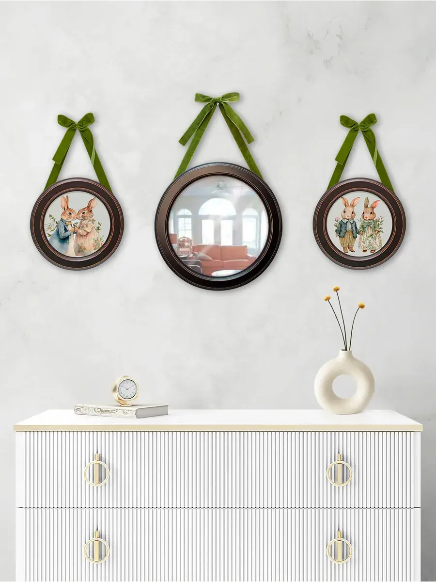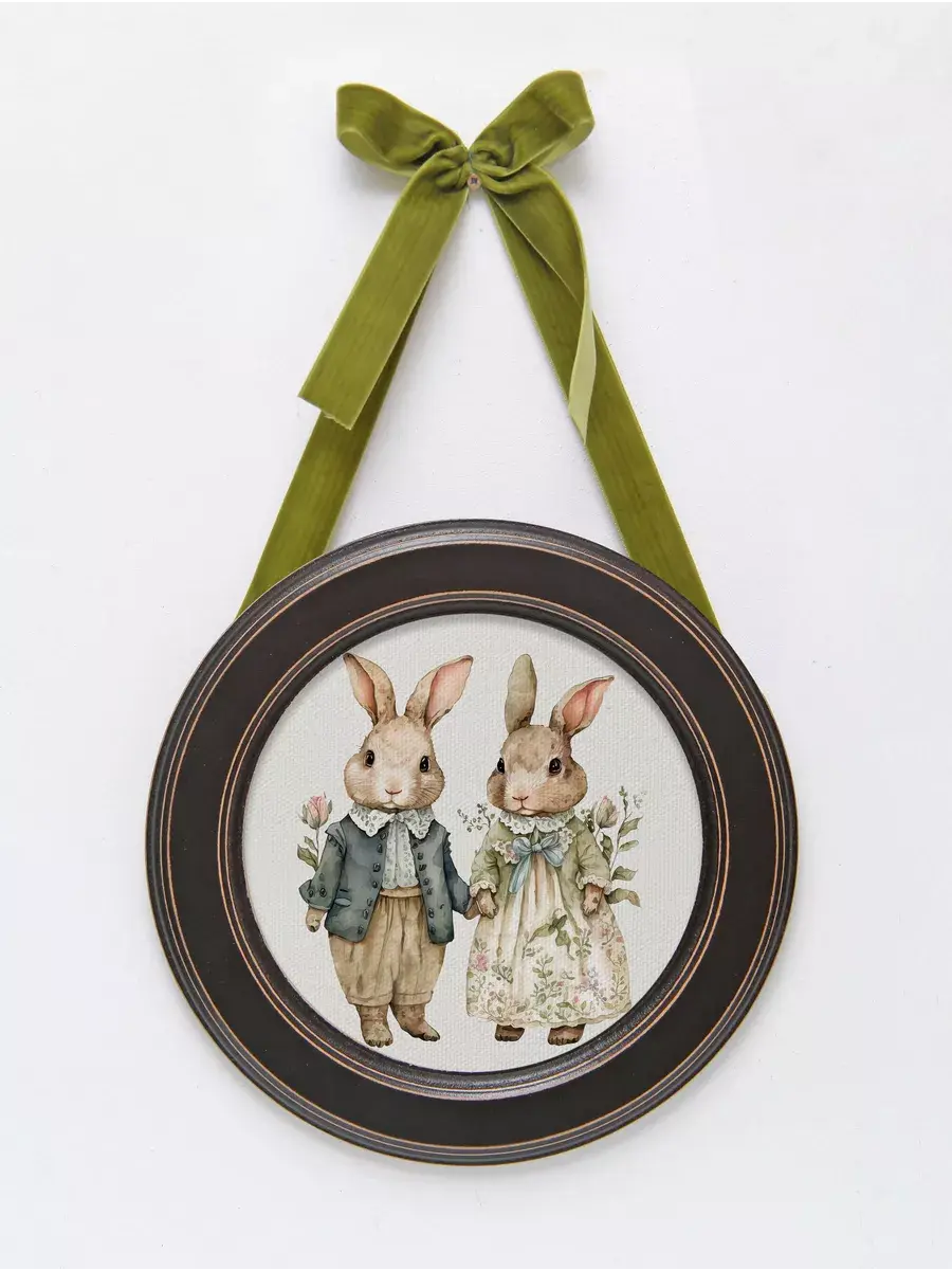 Настенный декор в нежных пастельных тонах с милыми зайчиками в раме приятного шоколадно-коричневого цвета. Бархатная лента благородного зеленого цвета добавляет картине изысканности. Картина напечатана на натуральном холсте, покрыта матовым лаком станет прекрасным дополнением и украшением интерьера.