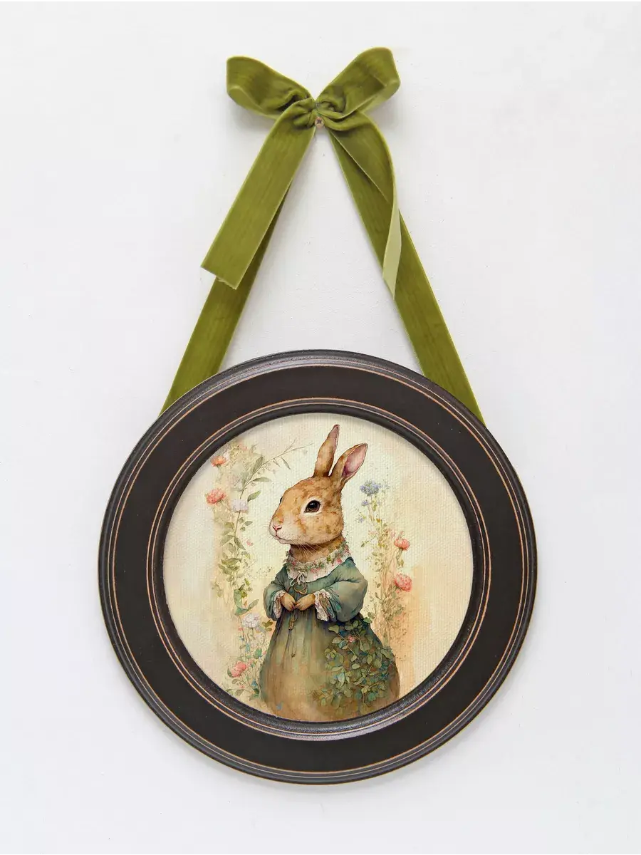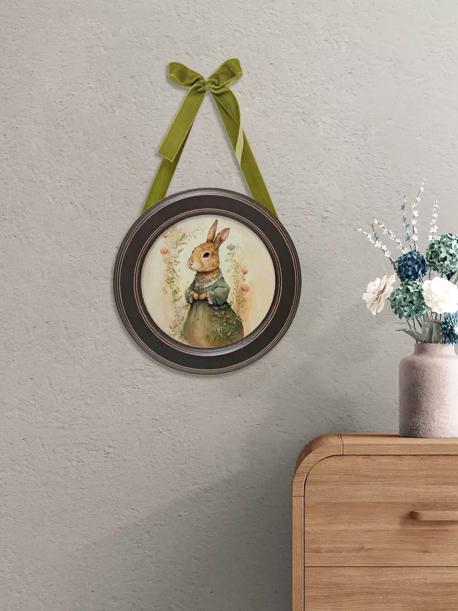 Настенный декор в нежных пастельных тонах с милыми зайчиками в раме приятного шоколадно-коричневого цвета. Бархатная лента благородного зеленого цвета добавляет картине изысканности. Картина напечатана на натуральном холсте, покрыта матовым лаком станет прекрасным дополнением и украшением интерьера.