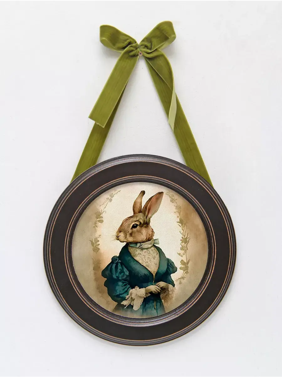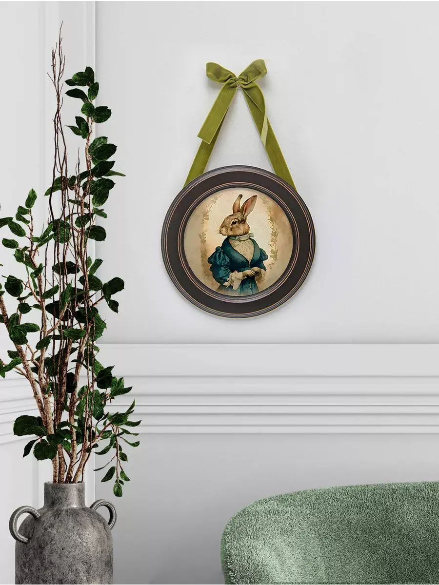 Настенный декор в нежных пастельных тонах с милыми зайчиками в раме приятного шоколадно-коричневого цвета. Бархатная лента благородного зеленого цвета добавляет картине изысканности. Картина напечатана на натуральном холсте, покрыта матовым лаком станет прекрасным дополнением и украшением интерьера.